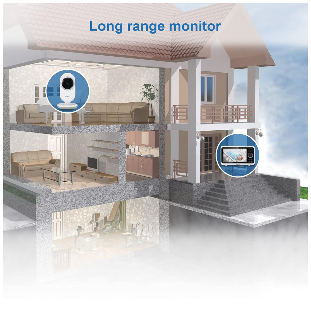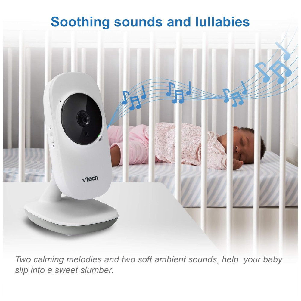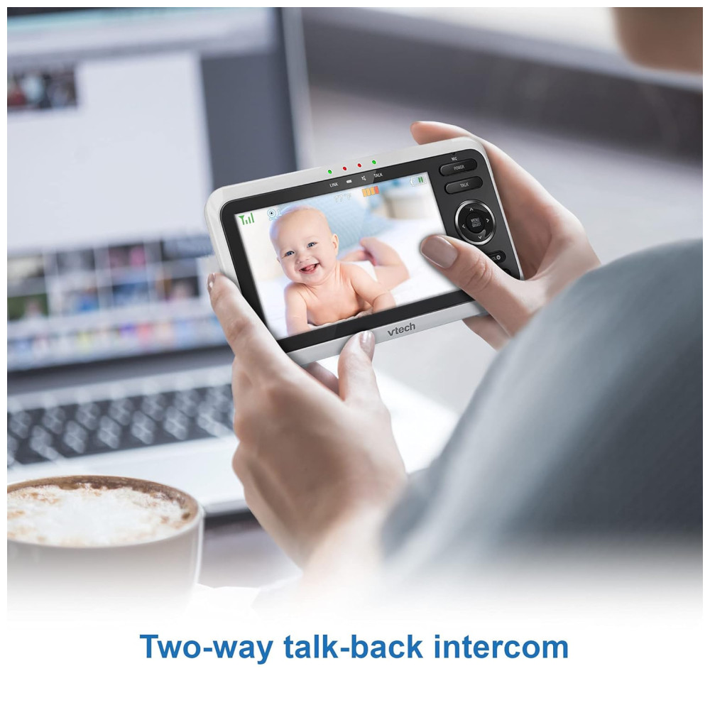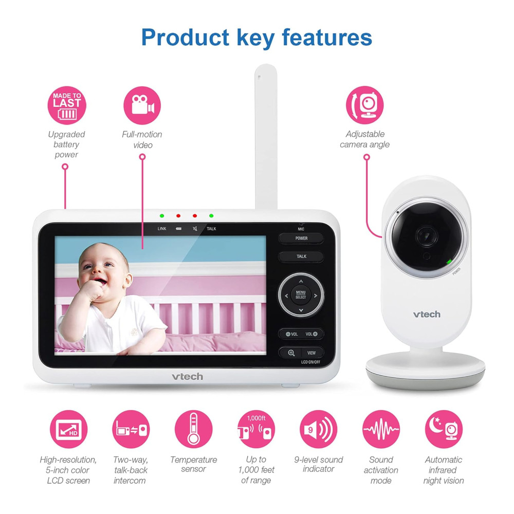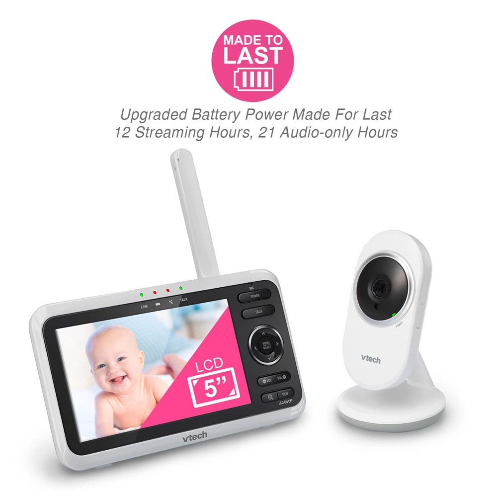 Mantenha um olho no seu bebê com a Babá Eletrônica de Vídeo Digital VTech VM350 5. Com uma tela LCD de alta resolução de 5 polegadas e visão noturna automática, você pode ver claramente seu bebê de qualquer lugar da casa ou quintal. A câmera fixa oferece zoom 2x e imagens coloridas durante o dia e imagens infravermelhas em escala de cinza à noite. Além disso, a babá eletrônica apresenta sons suaves e canções de ninar que tocam diretamente na unidade da câmera para ajudar o bebê a dormir bem. O sensor de temperatura integrado também alerta quando o quarto do bebê estiver ficando muito quente ou muito frio. A bateria recarregável tem uma duração de até 12 horas de streaming de vídeo e 21 horas de monitoramento somente de áudio, com uma única carga, permitindo monitorar seu bebê facilmente durante toda a noite. A babá eletrônica é transmitida através de um canal interno seguro de 2,4 GHz com tecnologia FHSS, garantindo a privacidade da sua família. Com a opção de conversa bidirecional, você pode falar com seu bebê de onde estiver. A tela do monitor pode ser desligada e o som silenciado para lhe dar o silêncio necessário e economizar energia. A babá eletrônica é fácil de configurar e não requer emparelhamento ou conexões. A câmera pode ser colocada em cima de uma mesa ou montada na parede.