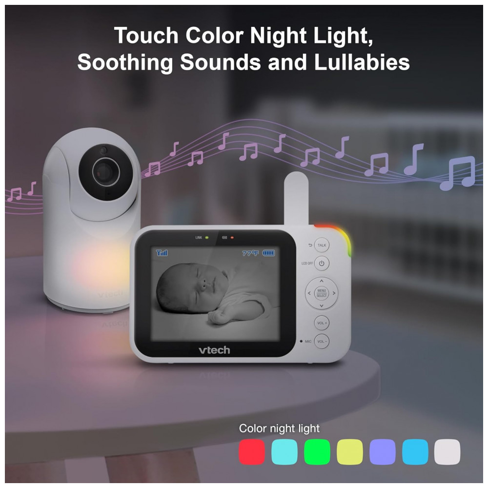 Mantenha-se de olho no seu pequeno com a ampla tela LCD de 8 cm do VTech VM4263 Monitor de Bebê em Vídeo Digital com Giro e Inclinação e Luz Noturna. Esse monitor de vídeo permite que você gire e incline para ter uma visão completa de todos os ângulos no berçário usando a unidade dos pais de longo alcance. Acalme seu bebê usando a luz noturna multicolorida sensível ao toque que se ajusta à iluminação do berçário, além de canções de ninar e sons suaves que tocam diretamente na unidade do bebê. Além disso, você pode garantir que seu bebê esteja confortável monitorando a temperatura do berçário, exibida na tela LCD de 8 cm. E, o mais importante, você pode verificar durante a soneca ou após escurecer, graças à visão noturna automática por infravermelho. TELA LCD COLORIDA DE ALTA RESOLUÇÃO DE 8 CM. Veja claramente cada movimento do seu bebê diretamente da unidade dos pais. Ao verificar seu bebê, você sentirá como se nunca tivesse saído do berçário. GIRO, INCLINAÇÃO E ZOOM DA CÂMERA A PARTIR DA UNIDADE DOS PAIS Veja seu pequeno se movimentando. A câmera gira até 270 graus de um lado para o outro e inclina até 25 graus para cima e para baixo. Precisa de mais detalhes? A câmera ainda dá zoom até 2 vezes. LUZ NOTURNA SENSÍVEL AO TOQUE As 7 luzes noturnas coloridas ajustam automaticamente o brilho para a iluminação ideal. Toque no ícone da luz para controlar a luz noturna. SONS RELAXANTES E CANÇÕES DE NINAR Duas melodias calmantes e dois sons suaves, incluindo um riacho e ruído branco, ajudam seu bebê a entrar em um sono tranquilo. CONVERSA BIDIRECIONAL ÀS VEZES, tudo que seu bebê precisa é ouvir o som da sua voz. Conforte seu bebê de qualquer cômodo com o intercomunicador integrado na unidade portátil dos pais. SENSOR DE TEMPERATURA Mantenha seu pequeno confortável. O indicador de temperatura na unidade dos pais avisa quando é hora de ajustar o termostato. VISÃO NOTURNA AUTOMÁTICA POR INFRAVERMELHO A câmera detecta automaticamente a luz fraca, permitindo que você veja os bocejos e alongamentos do seu bebê mesmo em quartos escuros.