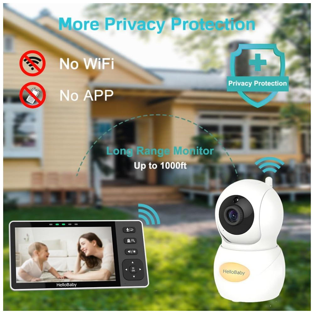 Conexão Estável sem Wi-Fi e à Prova de Hackers: Operando em um sistema de circuito fechado FHSS de 2ª geração de 2,4 GHz, o monitor HelloBaby não necessita de Wi-Fi ou aplicativo. Isso garante uma conexão estável e segura, sem riscos de hackers. A unidade da câmera é pareada apenas com um monitor, oferecendo uma transmissão dedicada e ininterrupta.