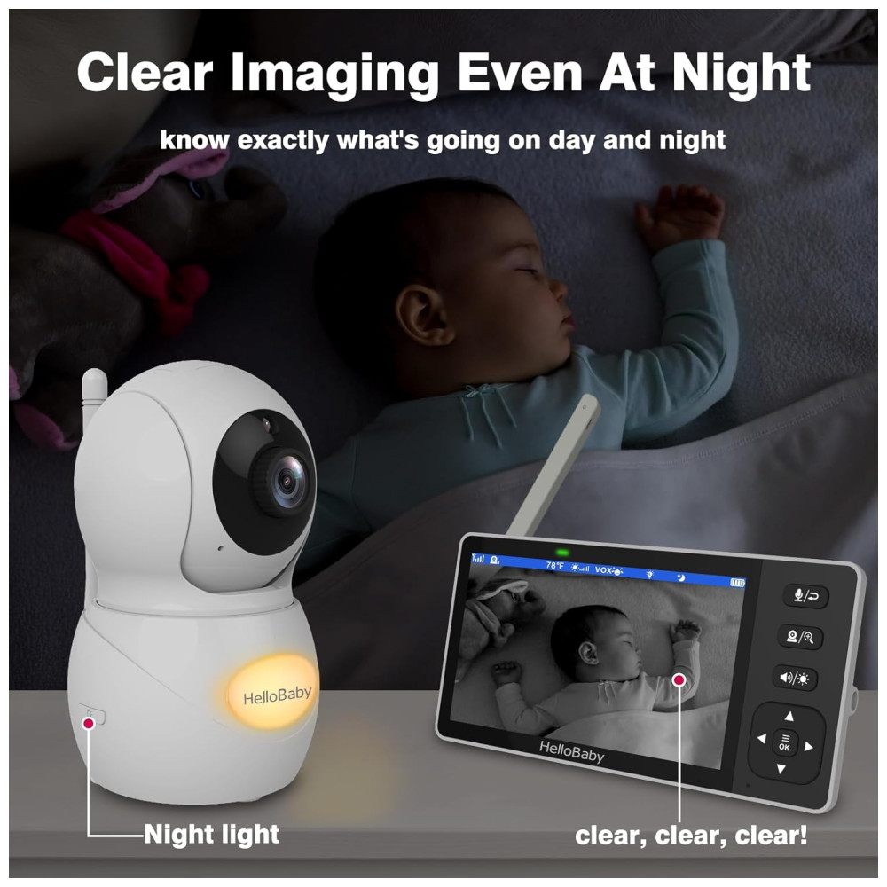Controle Remoto, Grande Angular e Monitor de Áudio e Vídeo Bidirecional: O HelloBaby permite monitoramento de áudio e vídeo em um alcance de até 1000 pés, com comunicação bidirecional clara. A câmera de pan tilt e zoom remoto, combinada com a lente grande angular, elimina pontos cegos e oferece imagens nítidas e ampliadas, permitindo que você mantenha seu bebê sempre à vista.