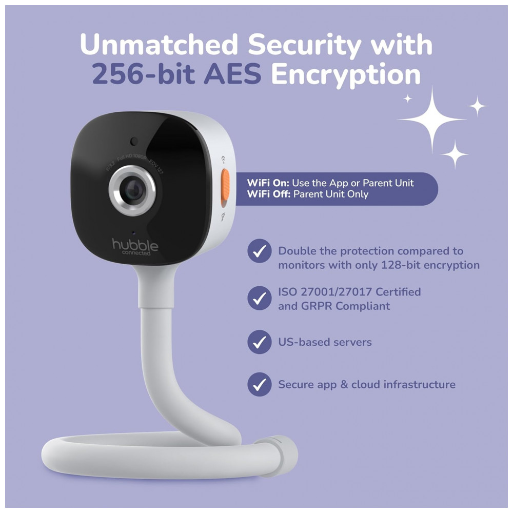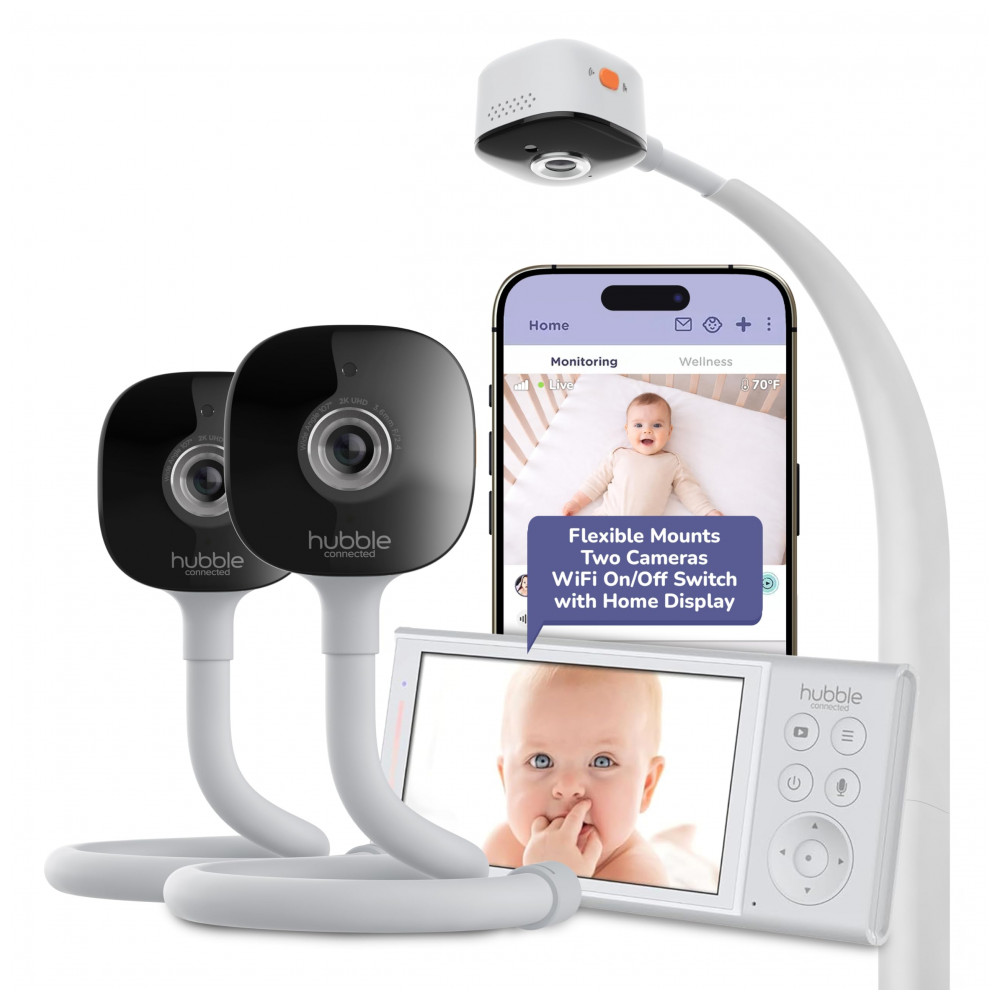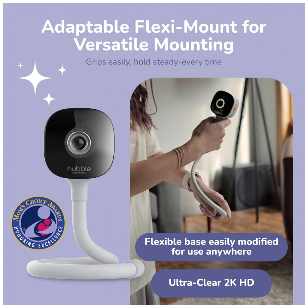 As câmeras incluem suporte flexível para montagem versátil em paredes ou superfícies, com alertas de som, movimento e temperatura. Suporta gravação ativada por movimento, histórico de vídeo e compartilhamento familiar via aplicativo HubbleClub, além de visualização local sem WiFi na tela dedicada.