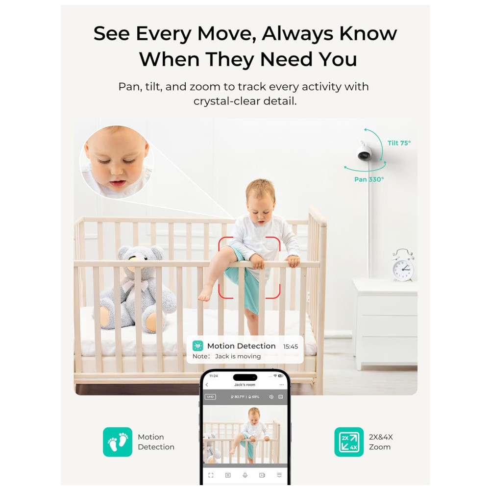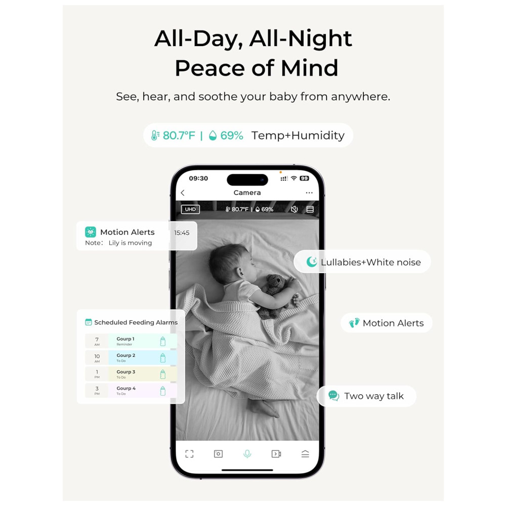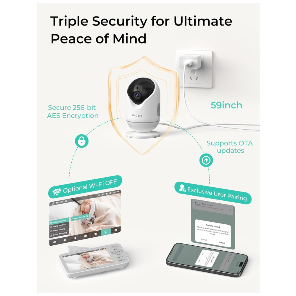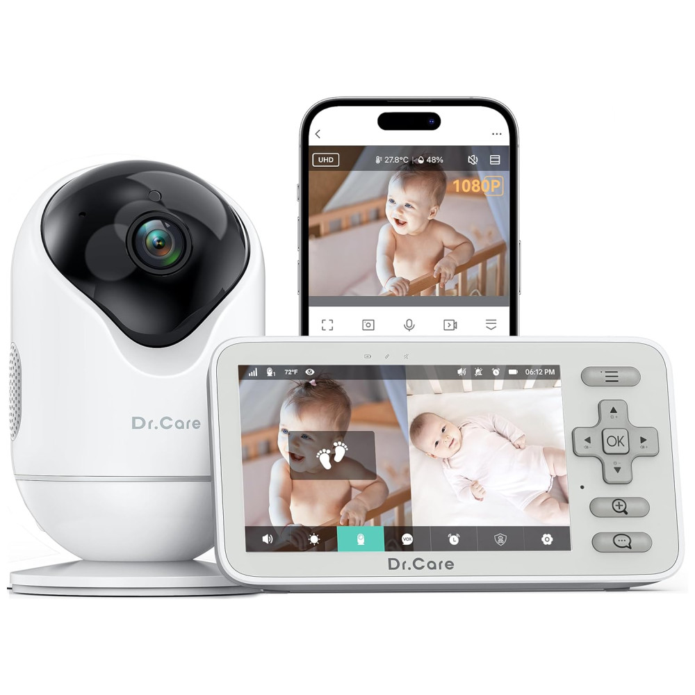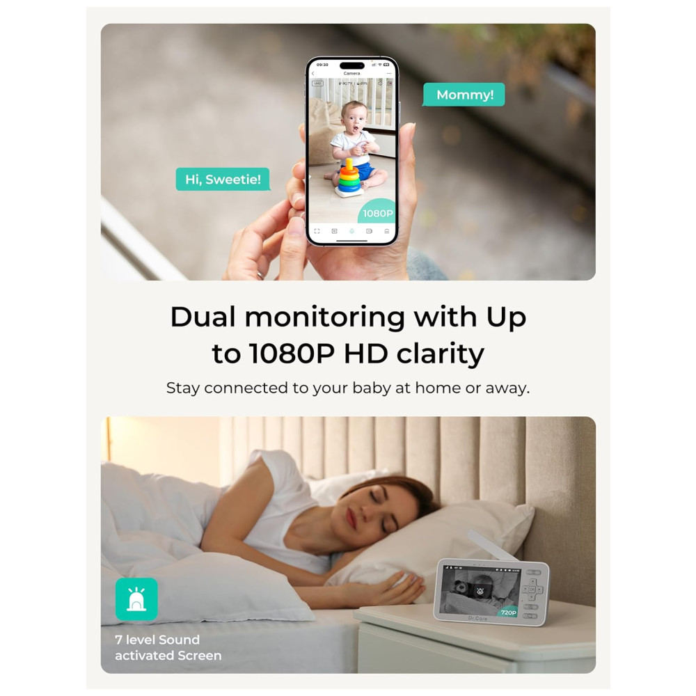 O Monitor de Bebê Inteligente Dr.Care VistaView Lite oferece monitoramento em modo duplo sem emendas, alternando facilmente entre monitor local livre de Wi-Fi e controle remoto por aplicativo. Com câmera de 1080P e tela dividida opcional em 720P, captura cada momento com clareza HD, garantindo visuais nítidos dia e noite, esteja você em casa ou longe. Com amplo alcance de visão e zoom de até 4x, ajuste facilmente a câmera para cobrir todos os cantos do ambiente e aproxime-se dos menores movimentos do seu bebê, sem perder nenhum momento. Mantenha-se conectado a qualquer hora, em qualquer lugar. Monitore o sono do seu bebê 24 horas por dia com a tela dividida em 1080P e visão noturna automática em HD, para nunca perder um movimento, choro ou mudança ambiental, mesmo no escuro. Fique ciente da temperatura e umidade para o máximo conforto. Lembretes personalizados de alimentação e notificações customizadas ajudam você a cuidar perfeitamente de um ou dois bebês. Receba alertas inteligentes de despertar com detecção de movimento para ficar conectado aos momentos de despertar do seu bebê, sendo avisado no instante em que começam a se mexer. Personalize as configurações de sensibilidade para capturar até os menores sinais de acordar ou reduza as notificações durante o tempo de brincadeira ativa. Proteção Tripla de Segurança para proteger sua família com privacidade máxima. Suporte a atualizações OTA para mais funcionalidades. Armazene memórias preciosas com até 128GB de armazenamento em cartão SD (vendido separadamente) ou armazenamento em nuvem opcional. Compartilhe transmissões ao vivo e eventos com até 5 membros da família. O pacote inclui 1 monitor de bebê inteligente Dr.Care VistaView Lite, 1 unidade do bebê, 2 cabos de carregamento USB, 2 adaptadores de energia e 1 manual do usuário.