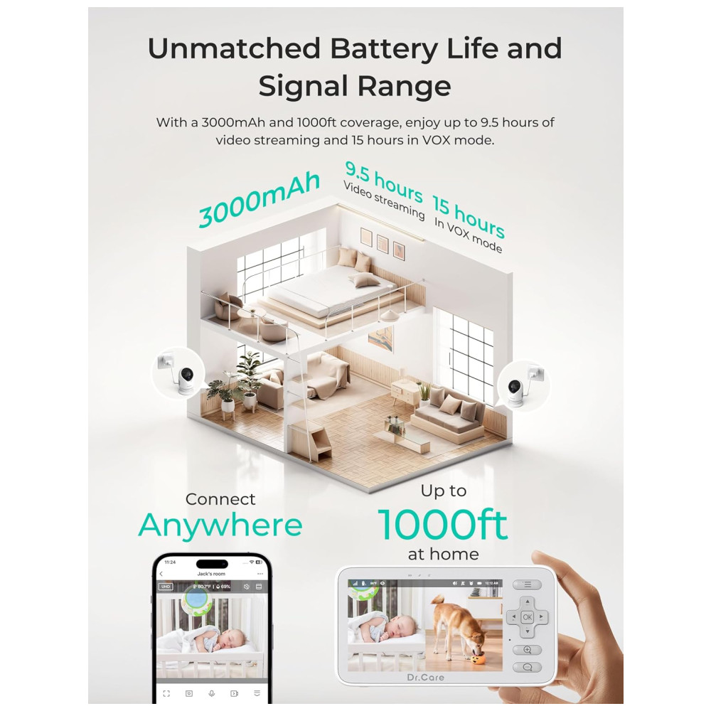 Babá Eletrônica Inteligente Dr.Care VistaView Lite WiFi: 1080P Visão Noturna Bateria 3000mAh Controle por App