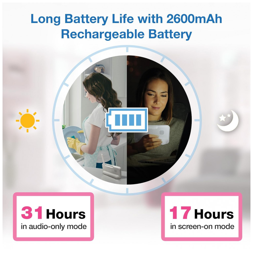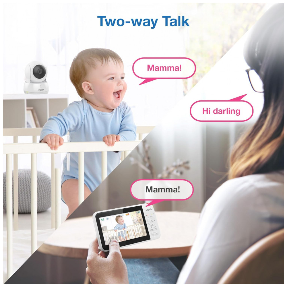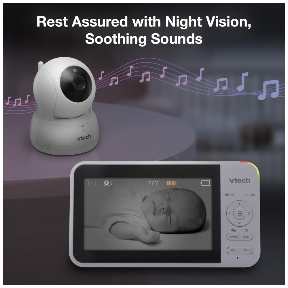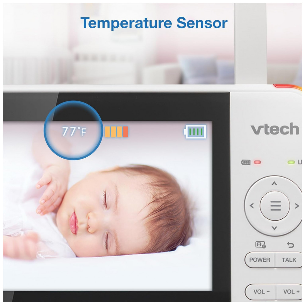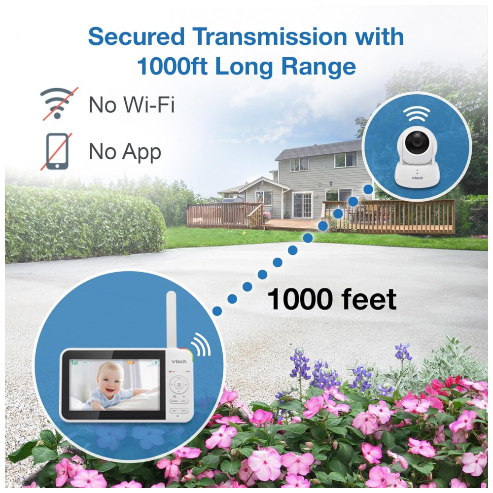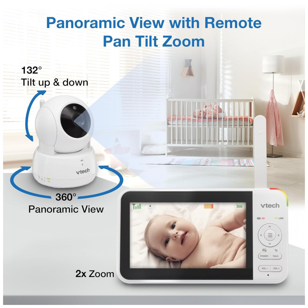 Mantenha-se conectado ao seu pequeno com o Monitor de Vídeo Digital VTech VM9243 com Pan Tilt e tela LCD de 12 cm. Esse monitor de vídeo permite que você faça panorâmicas e inclinações para ter uma visão completa de todos os ângulos no quarto do bebê, usando a unidade dos pais de longo alcance. Acalme seu bebê com canções de ninar e sons suaves reproduzidos diretamente da unidade do bebê. Além disso, você pode garantir que seu bebê esteja confortável monitorando a temperatura do quarto, exibida na tela LCD. Com a melhor bateria da indústria, você pode monitorar seu bebê facilmente por toda a noite, com até 17 horas de transmissão de vídeo com uma única carga. Com modo de ÁUDIO até 31 horas ou VÍDEO até 17 horas, monitore seu bebê com facilidade por toda a noite ou dia. VISÃO PANORÂMICA REMOTA PARA UMA VISÃO PANORÂMICA DE 360 GRAUS – Visualize 360 graus com 132 graus de visão vertical para cima e para baixo. Aproxime até 2x para ficar mais perto do bebê. TELA LCD DE 12 CM – Verifique seu bebê com a unidade dos pais LCD de 5 polegadas de qualquer cômodo da casa. CÂMERA DE VISÃO NOTURNA COM MODO APENAS ÁUDIO – Veja claramente seu bebê com a visão noturna automática por infravermelho. Quando detecta algum som acima da sua configuração de volume de áudio, a tela se acende automaticamente. INSTALAÇÃO FÁCIL E TRANSMISSÃO SEGURA – Sem necessidade de pareamento ou conexões Wi-Fi. Sem aplicativos necessários. Com alcance de até 304 metros, você pode realizar suas atividades diárias e se manter conectado ao seu bebê, mesmo do quintal. SONS RELAXANTES E SENSOR DE TEMPERATURA – Crie e monitore um ambiente confortável e agradável para o bebê, com a temperatura ideal e sons naturais/canções de ninar para acalmar os sentidos. COMUNICAÇÃO BIDIRECIONAL – Às vezes, tudo o que seu bebê precisa é ouvir o som da sua voz. Conforte seu bebê de qualquer cômodo com o intercomunicador embutido na unidade dos pais portátil.
