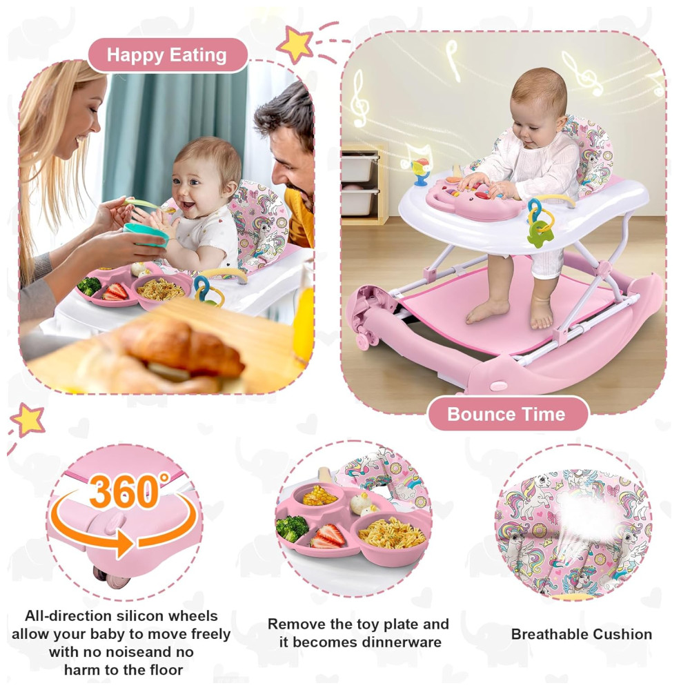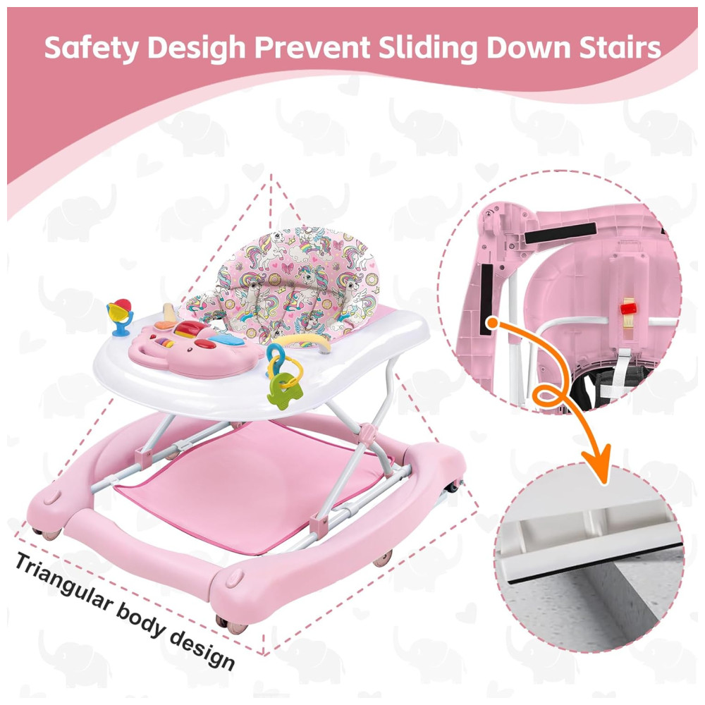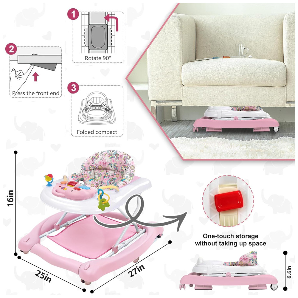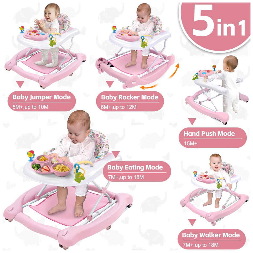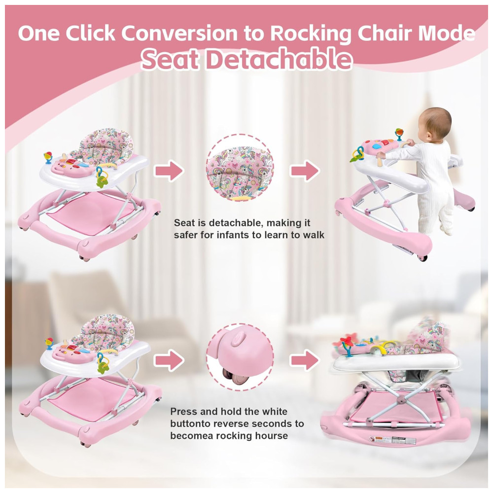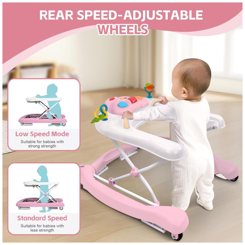 Andador Dobrável 5 em 1 Pawtong Centro de Atividades Balanço Assento Empurrador Altura Ajustável Rodas Traseiras Velocidade Regulável Rosa