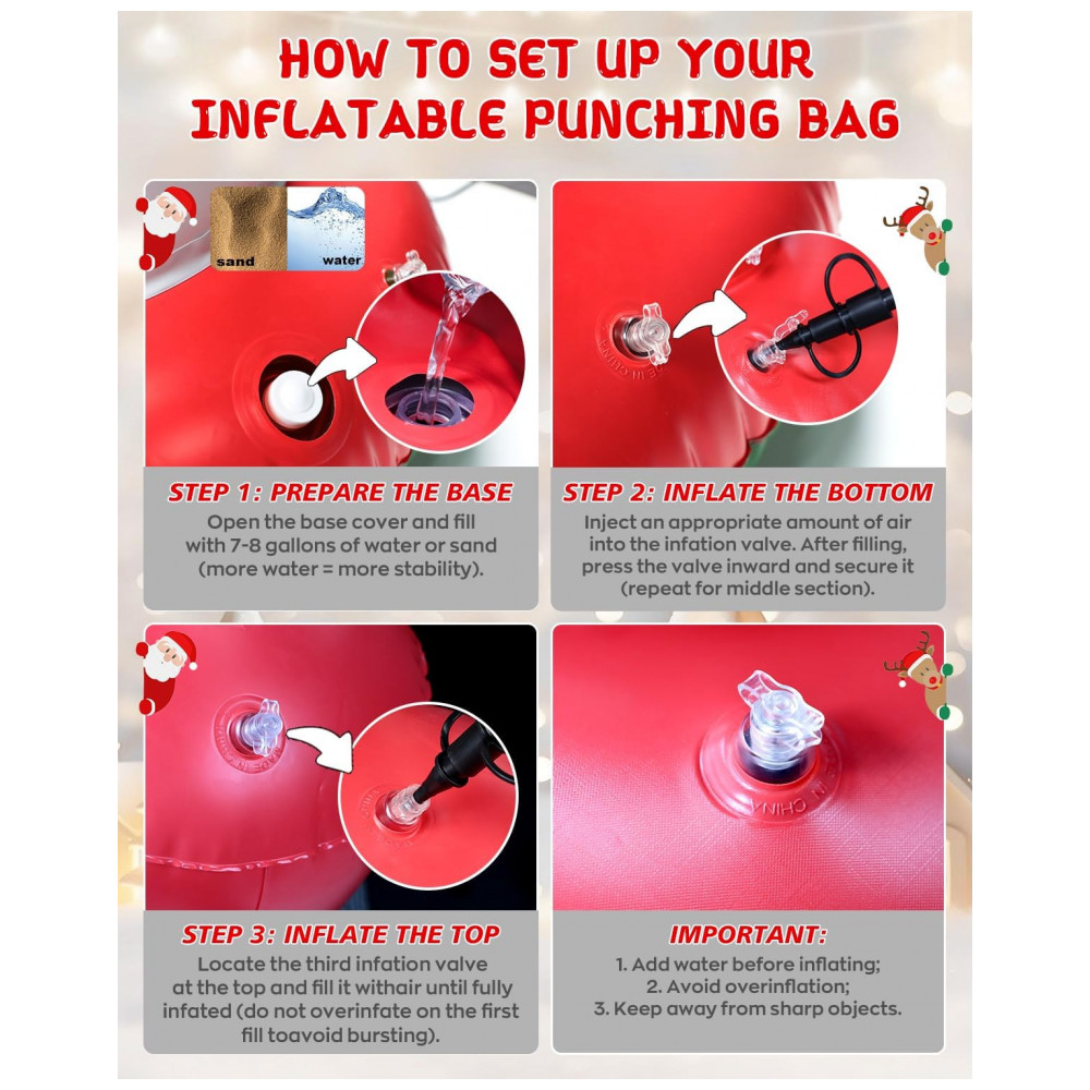 Bolsa de pancadas inflável com durabilidade superior para brincadeiras energéticas. Fabricada em PVC resistente a rasgos com 0,5 mm de espessura, esta bolsa foi projetada para suportar sessões intensas de treino. É a bolsa definitiva para socos e chutes, capaz de aguentar milhares de impactos mantendo sua forma. Um brinquedo de pancadas mais seguro e durável que os pais podem confiar. Desenvolva habilidades e aumente a confiança do seu filho! Socar e chutar essa bolsa inflável é uma forma divertida e dinâmica de aprimorar habilidades motoras, equilíbrio e coordenação. Esta bolsa infantil de taekwondo ajuda as crianças a canalizar sua energia de forma positiva, construindo força e autoconfiança a cada golpe. Ideal para crianças de 3 a 8 anos. Estimule o movimento! A bolsa para crianças com tema natalino de 147 cm cria um ambiente festivo com seu design único e sinos decorativos. É mais que um brinquedo, é uma experiência perfeita para incentivar a atividade física dos pequenos. Montagem rápida e armazenamento fácil! A diversão começa em minutos – basta inflar esta bolsa utilizando o ar e água conforme as instruções incluídas. Vem com bomba de mão e reparos para conserto rápido de vazamentos. Pode ser dobrada para ocupar pouco espaço, ideal para uso interno e externo. Perfeita para momentos em família! Este kit completo de treino para boxe infantil inclui a bolsa de 147 cm, luvas de boxe para crianças, bomba de ar, cartão de Natal e embalagem elegante, proporcionando uma ótima oportunidade para diversão e aprendizado.