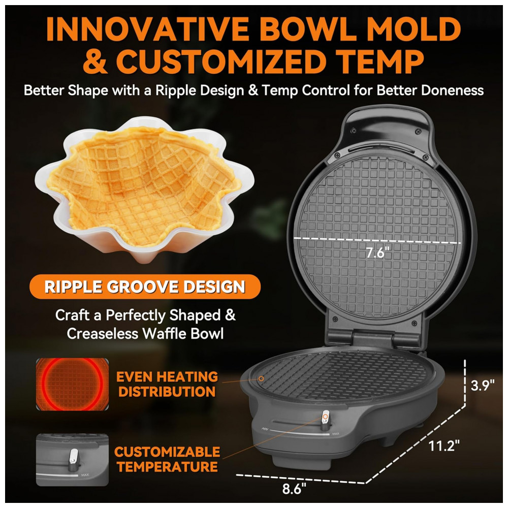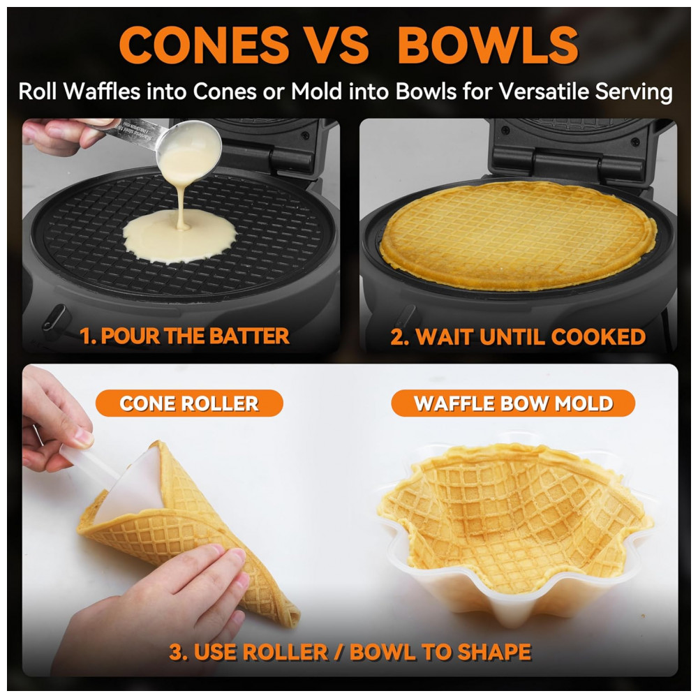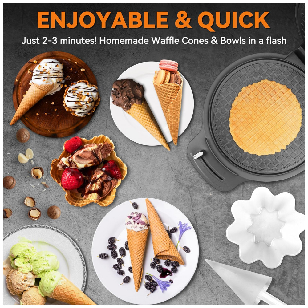 Design Exclusivo e Versátil: Esta incrível máquina 2 em 1 da Baker’s Friend vem com dois acessórios – moldes para casquinha de waffle e rolos para cones – permitindo que você crie tanto casquinhas quanto tigelas de waffle perfeitas para sorvetes e diversas sobremesas. Seu design especial conta com um molde com ranhuras que garante acabamento liso e sem rugas, proporcionando uma apresentação profissional à sua sobremesa.