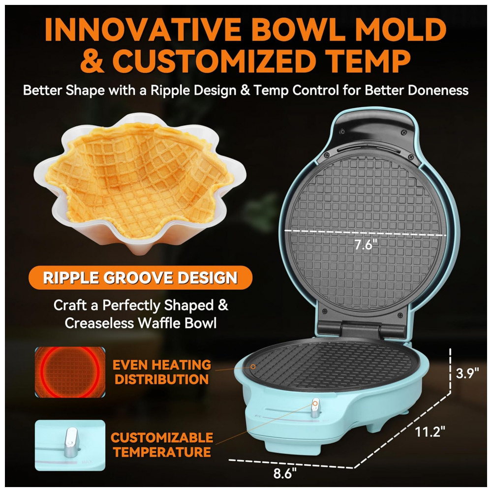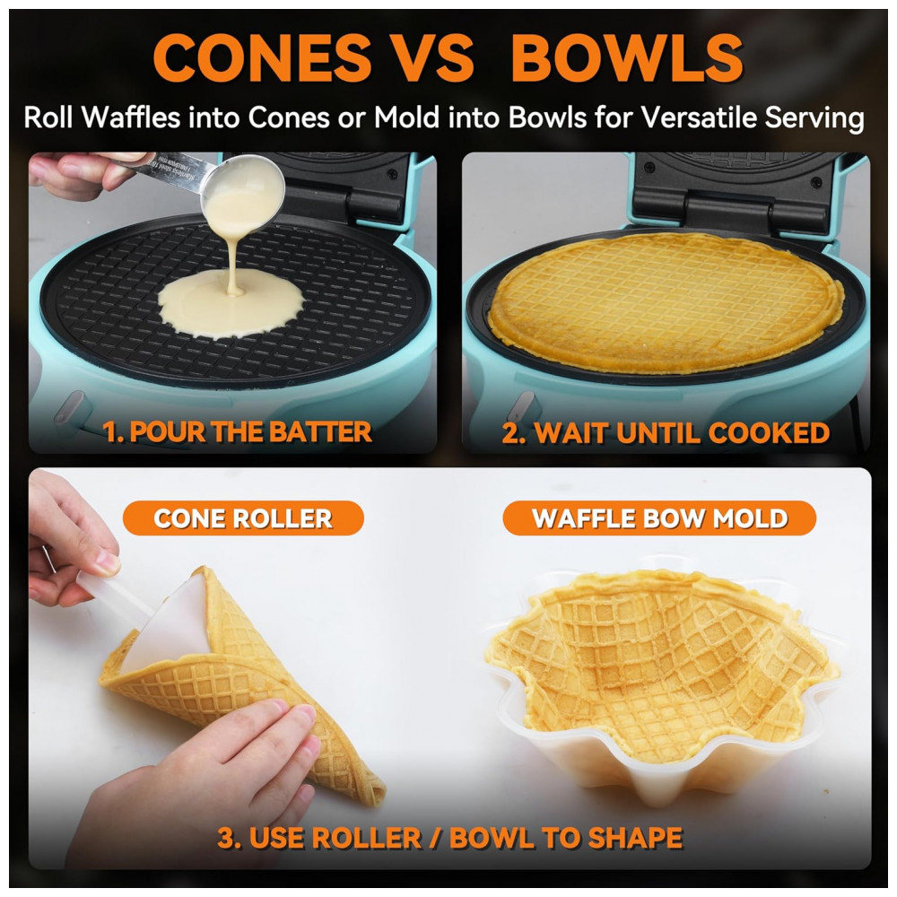Descubra a incrível Máquina para Waffle Cone da Baker’s Friend, uma solução completa e versátil para criar cones e tigelas de waffle perfeitos para sorvetes e sobremesas variadas. Este conjunto exclusivo inclui dois acessórios: o molde para tigela de waffle e o rolo para cones, permitindo que você prepare tanto cones crocantes quanto tigelas elegantes, ideais para conservar a textura e sabor dos seus sorvetes favoritos. O molde da tigela possui um design especial com relevos que garantem um acabamento liso e sem rugas, realçando a apresentação dos seus pratos.