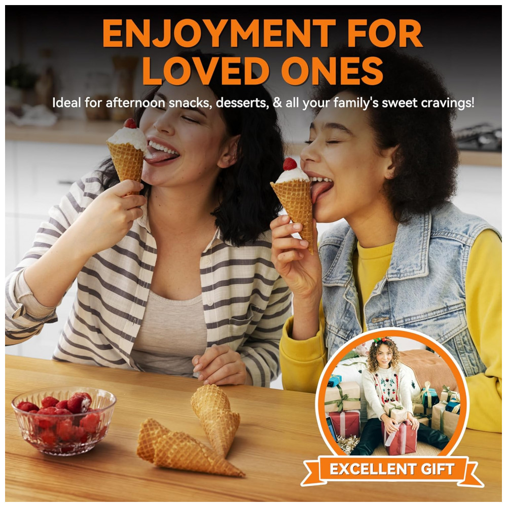 Este aparelho multifuncional é ideal para uso doméstico, funcionando também como uma máquina para stroopwafels, as tradicionais bolachas holandesas com recheio de caramelo. Prepare deliciosas casquinhas e tigelas para sorvete, iogurte e até snacks, ampliando suas possibilidades culinárias com praticidade e estilo.