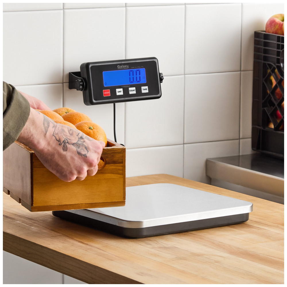 A Galaxy RS220LP é uma balança de recebimento digital de perfil baixo projetada para ambientes comerciais e industriais, com plataforma de aço inoxidável de 30 x 28,4 cm para pesar até 100 kg. O display remoto LCD retroiluminado de 1,9 cm permite leitura clara a distância, conectado por cabo espiral de 2,7 m com suporte de montagem. Suporta pesagem em libras, libras-onças ou quilogramas, com incrementos de 0,1 kg ou 0,2 lb, e função tara para dedução de peso de recipientes.