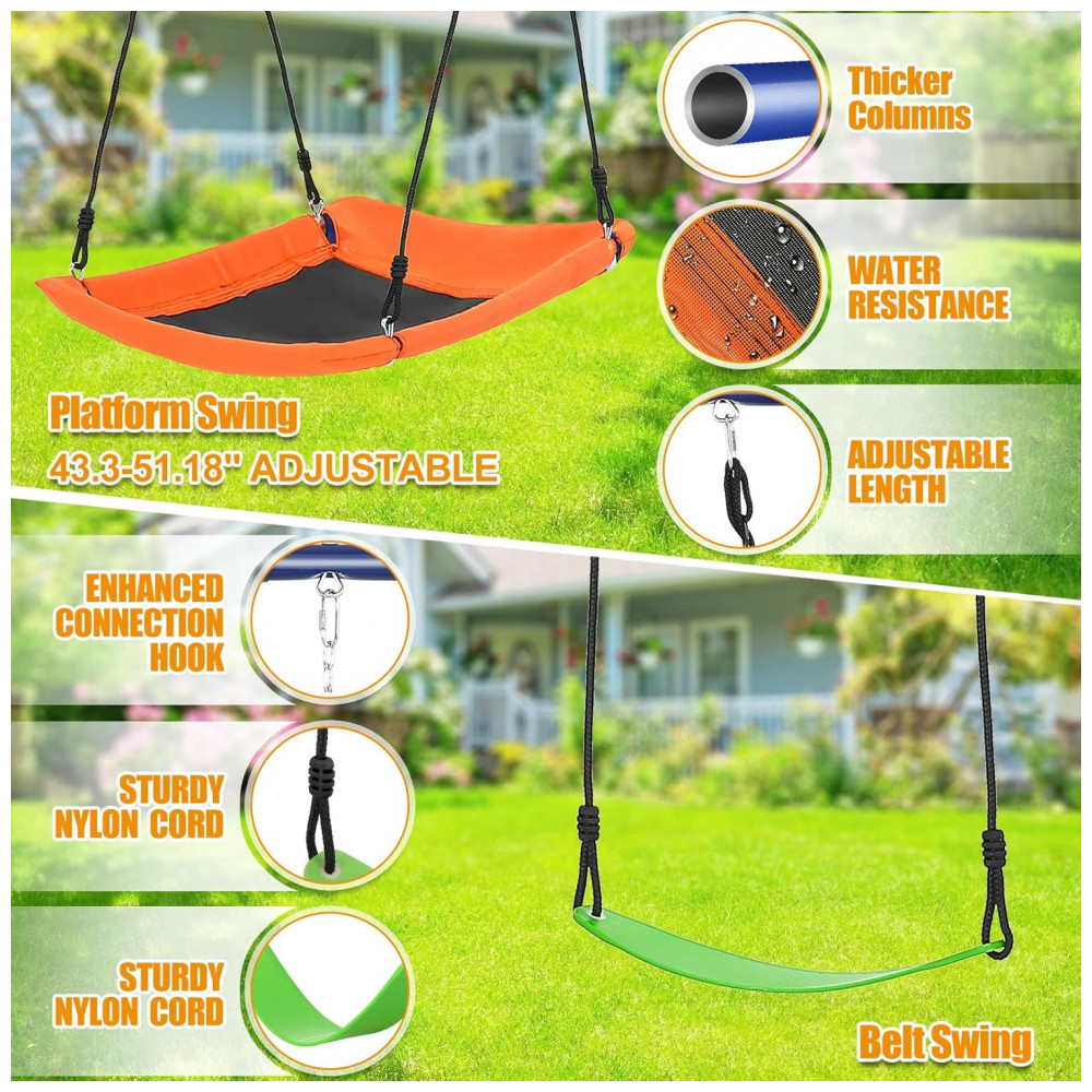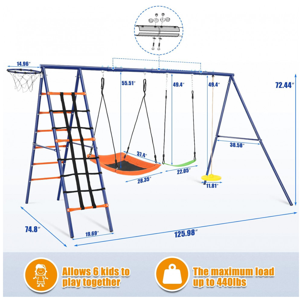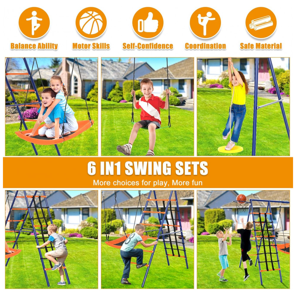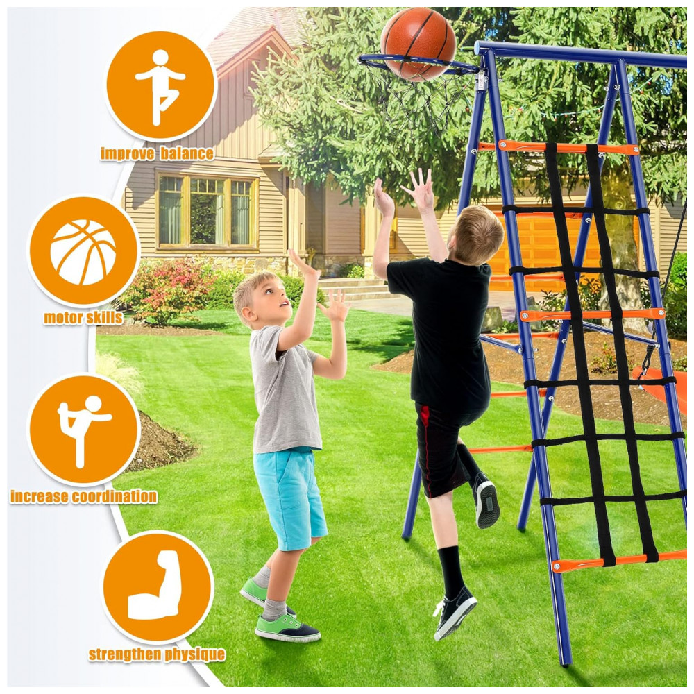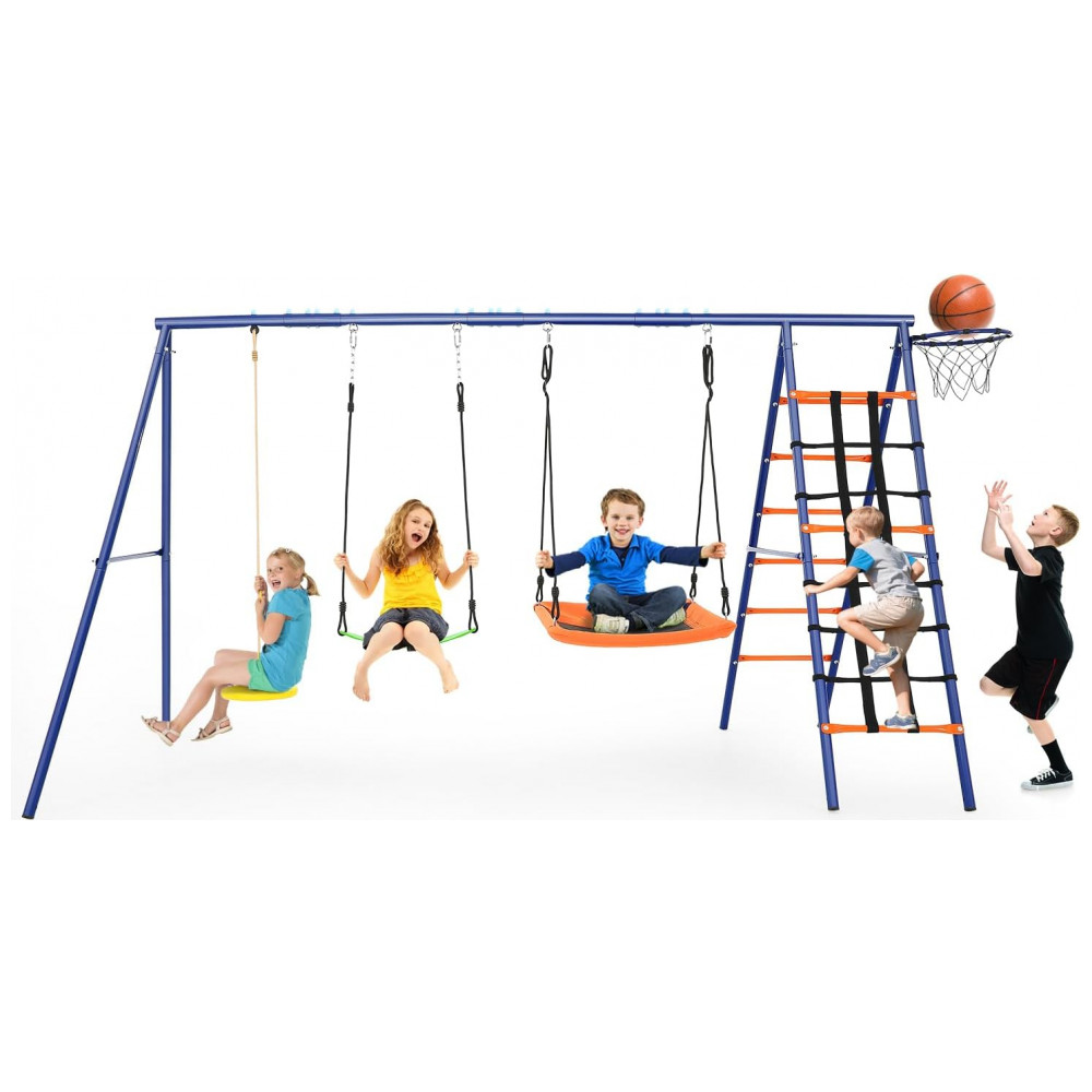 Balanço Infantil 6 em 1 SIHANM Multijogos Colorido Metal Reforçado com 3 Assentos Ajustáveis Escada Rede Cesta de Basquete