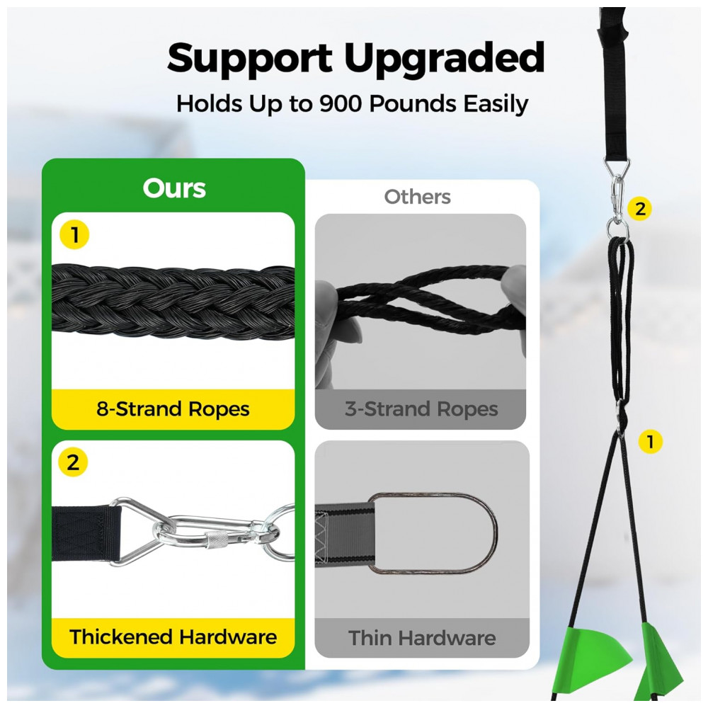 Assento construído em tecido Oxford 900D com resistência a UV e abrasão, sustentado por tubos de ferro com revestimento de espuma para proteção e ergonomia. Cordas multi-fios trançadas ajustáveis de 120–180 cm (3,9–5,9 ft) via gancho S garantem variação de altura.