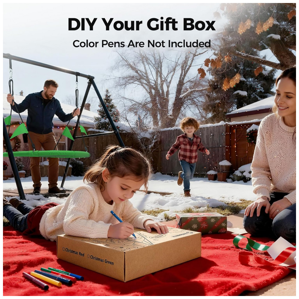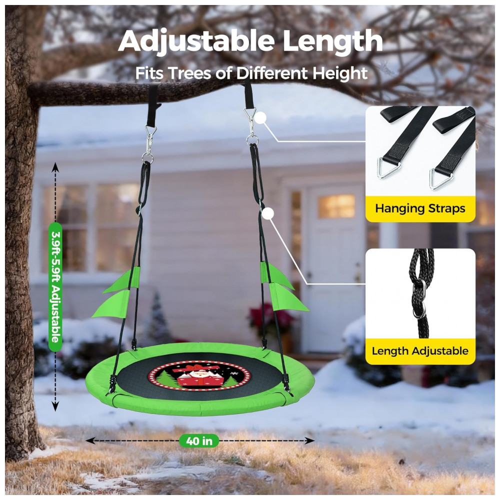Balanço redondo saucer PACEARTH de 40 polegadas (102 cm) projetado para fixação em árvores ou kits de balanço residenciais, com assento em tecido Oxford 900D e armação em ferro acolchoada para atividades recreativas externas. Paleta de cores natalina com pintura no assento, acompanhado de tiras reforçadas e mosquetões galvanizados para ancoragem em galhos de 10–13 cm de diâmetro, dentro do limite de carga máxima.