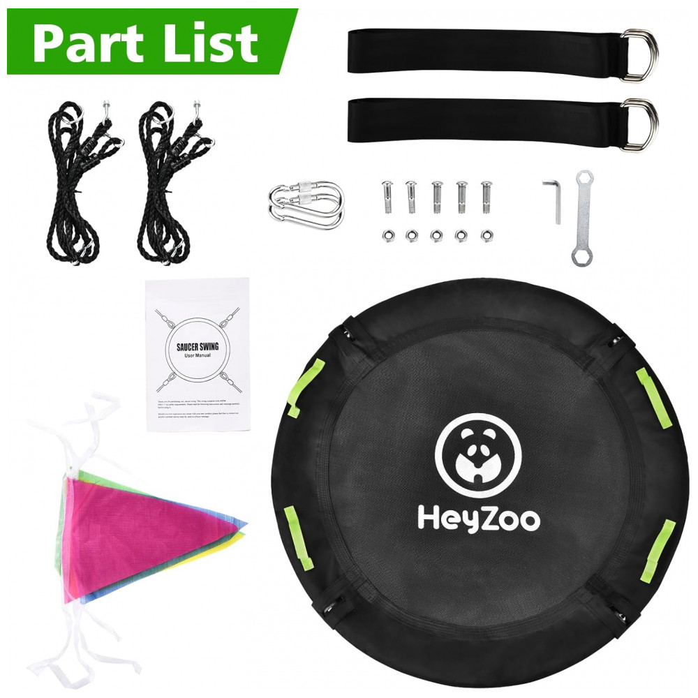 Conteúdo da embalagem: 1 balanço saucer (armação, cordas multi-fios, 2 tiras de suspensão pesadas, 2 mosquetões de aço inoxidável, 4 bandeiras decorativas, hardware completo, instruções passo a passo)