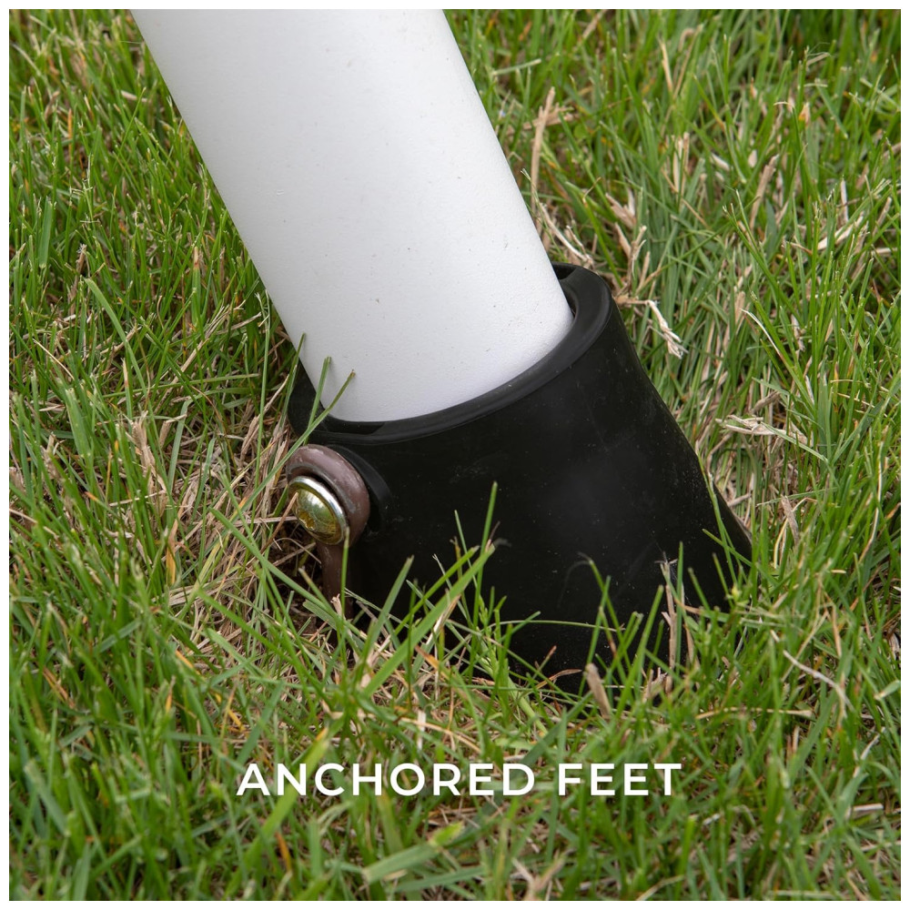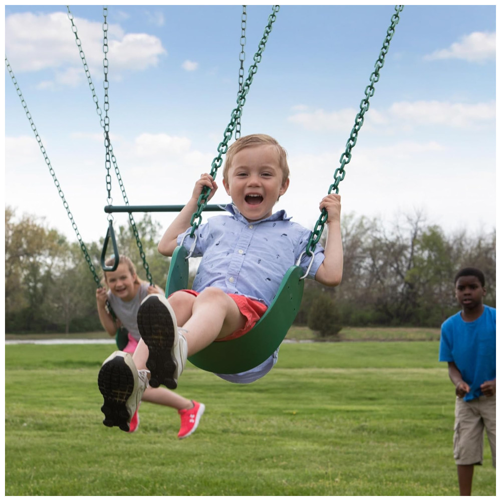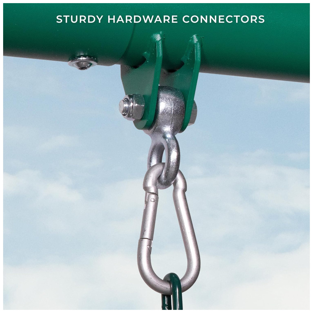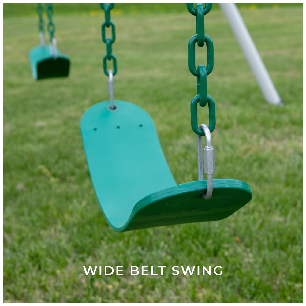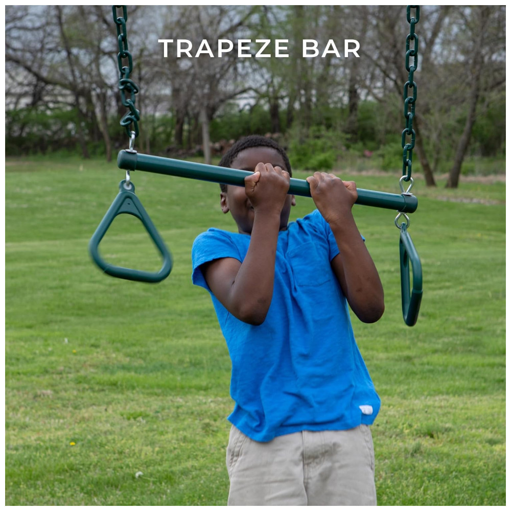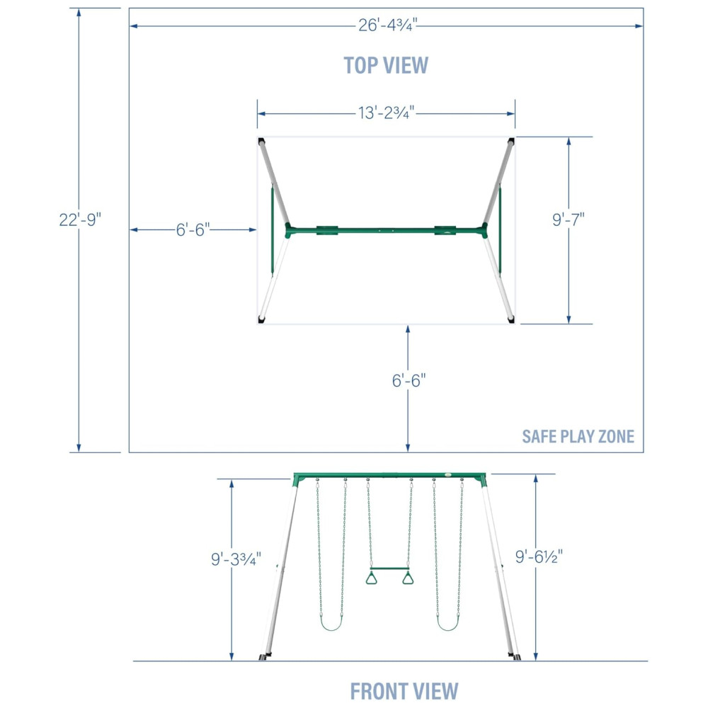 Inclui dois balanços de cinto e uma barra de trapézio de metal, com correntes de balanço pesadas para maior durabilidade. Suas dimensões de base são: 4,03 m de comprimento, 2,93 m de largura e 2,91 m de altura. É projetado para atender ou superar os padrões ASTM (Código F1148-19), sendo adequado para uso residencial.