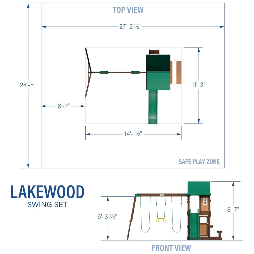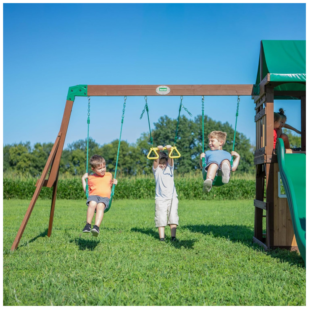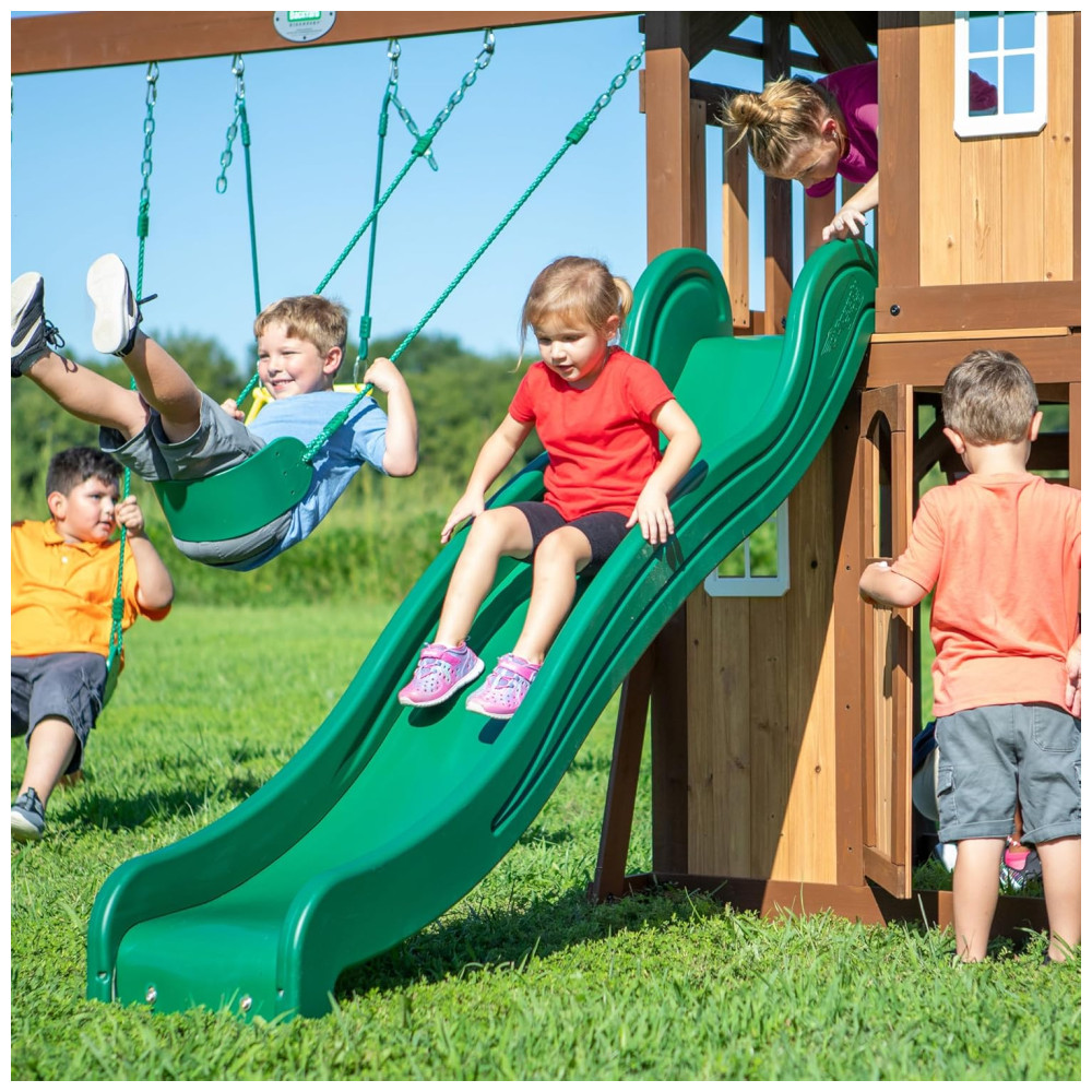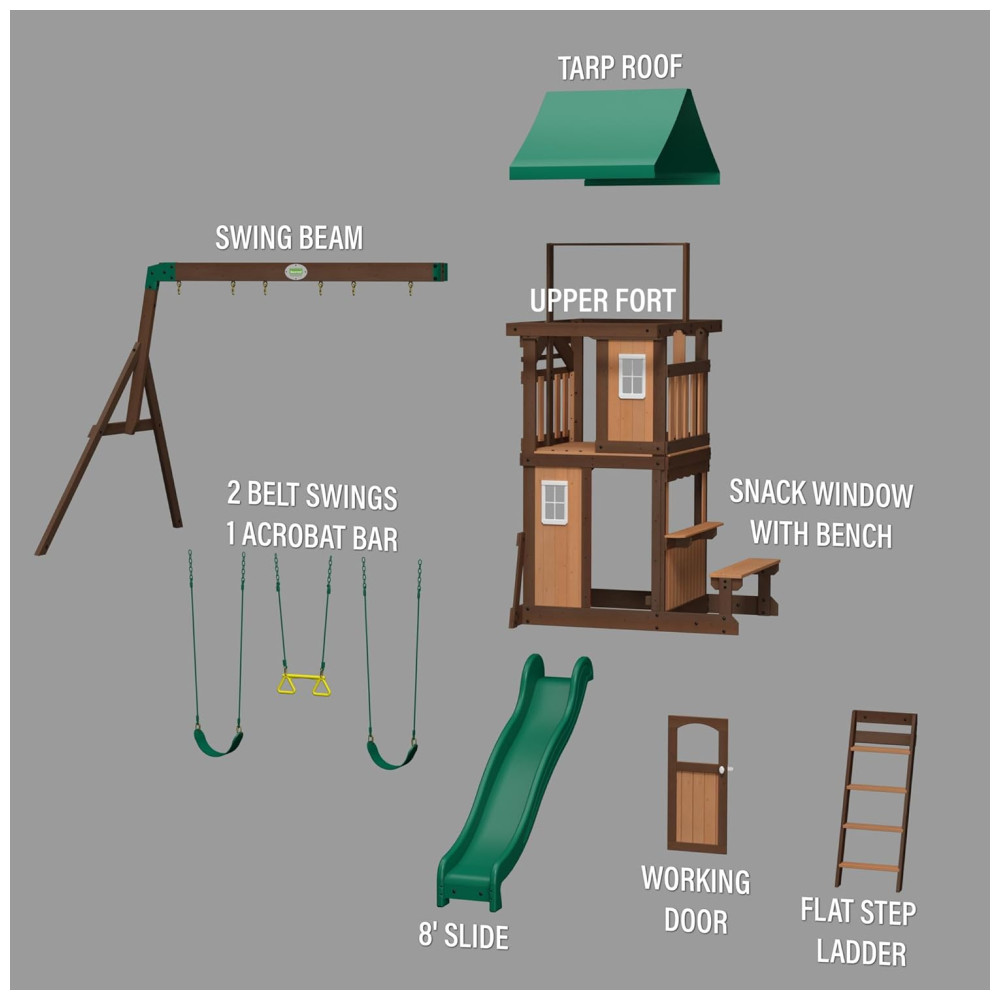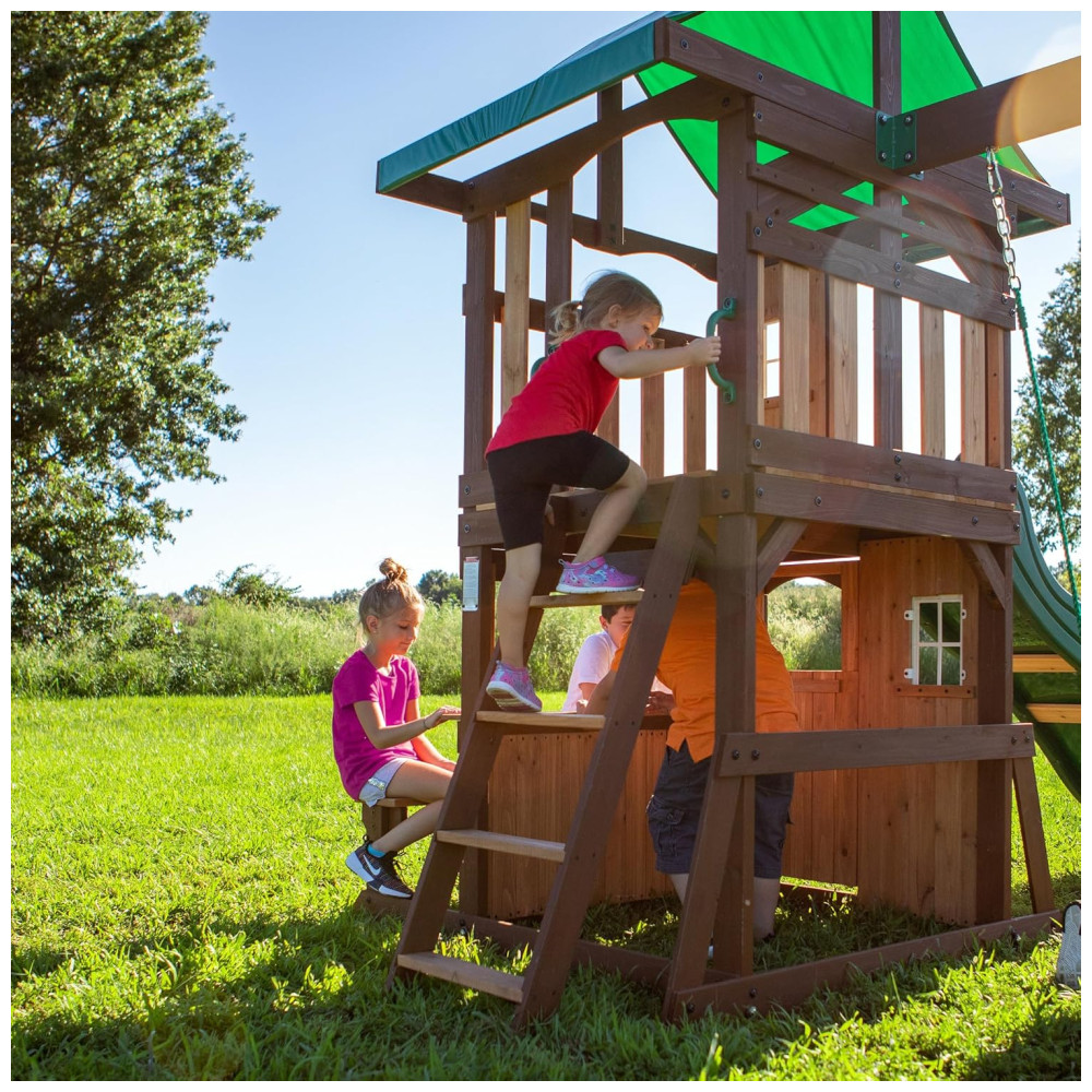 Balanços Backyard Discovery Lakewood em Madeira Cedro Deck Superior Coberto com Janela Branca Escorregador com Trilhos Forte Inferior e Escada.