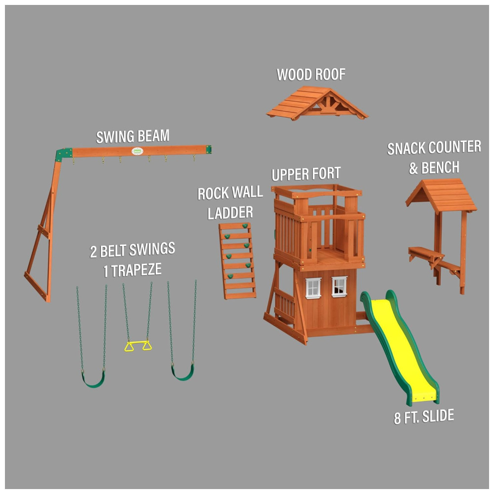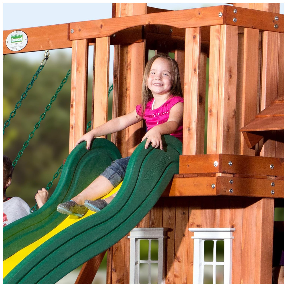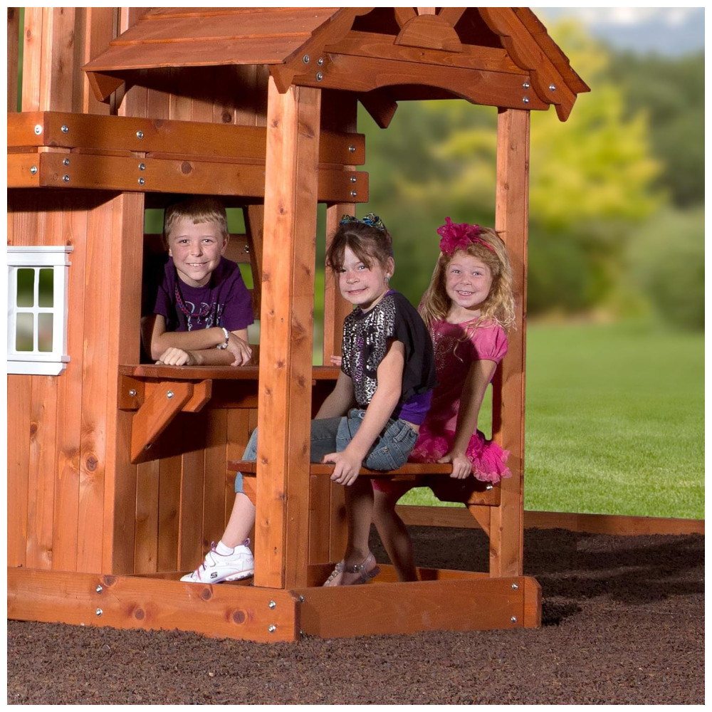 Este playset Backyard Discovery Tanglewood oferece diversas opções de diversão para crianças. Ele inclui um forte superior com telhado de madeira, beirais em estilo sol nascente e varanda de observação, além de um forte inferior com janelas com moldura branca. O conjunto também conta com um quiosque de lanches com janela e banco embutido coberto, dois balanços de cinto e uma barra de trapézio para mais diversão. Para aventuras ainda mais emocionantes, há uma parede de escalada de pedras e um escorregador super rápido de 2,4 metros de comprimento.