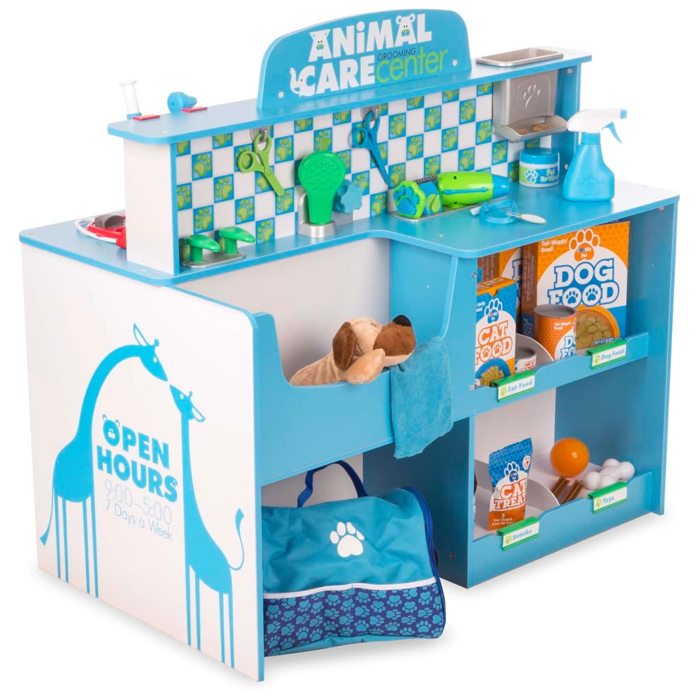 Este centro de atividades de madeira Melissa Doug Animal Care Veterinarian Groomer é um presente ideal para crianças de 3 anos ou mais. O robusto centro de jogos possui uma lente de raio X com dois raios X removíveis, balança para animais de estimação, monitor de pressão arterial, pia, rampa de tratamento, dispensador de garrafa com bomba e muito armazenamento. Existem ganchos e suportes para muitos acessórios.