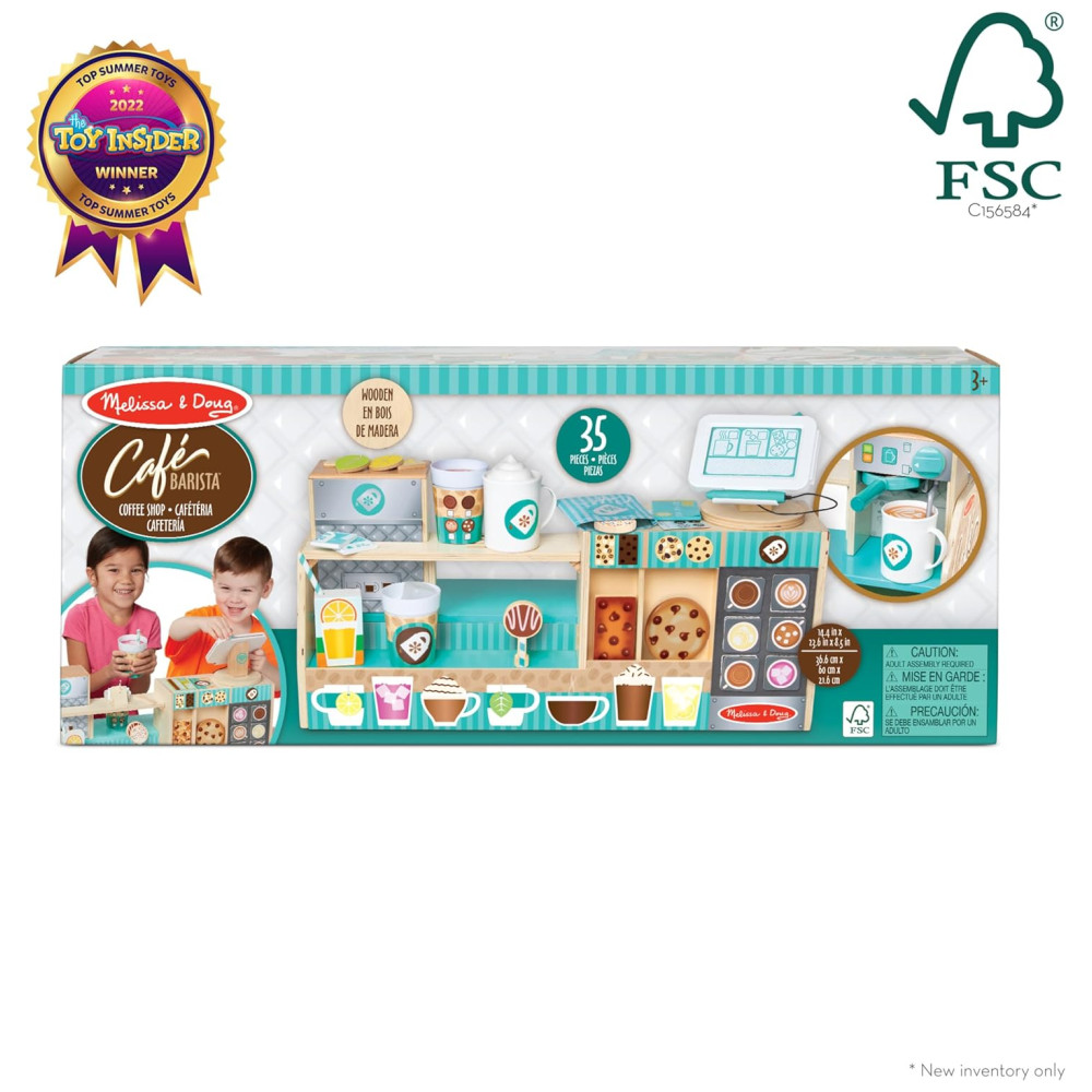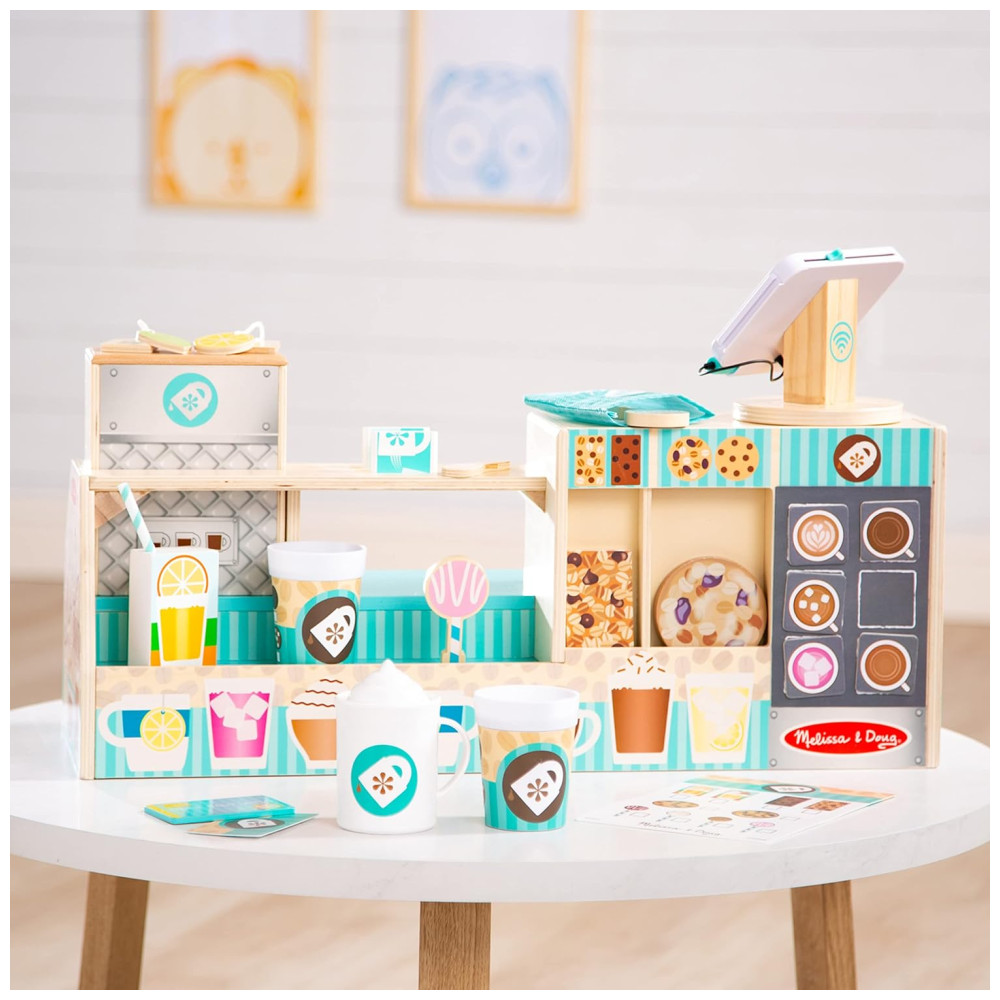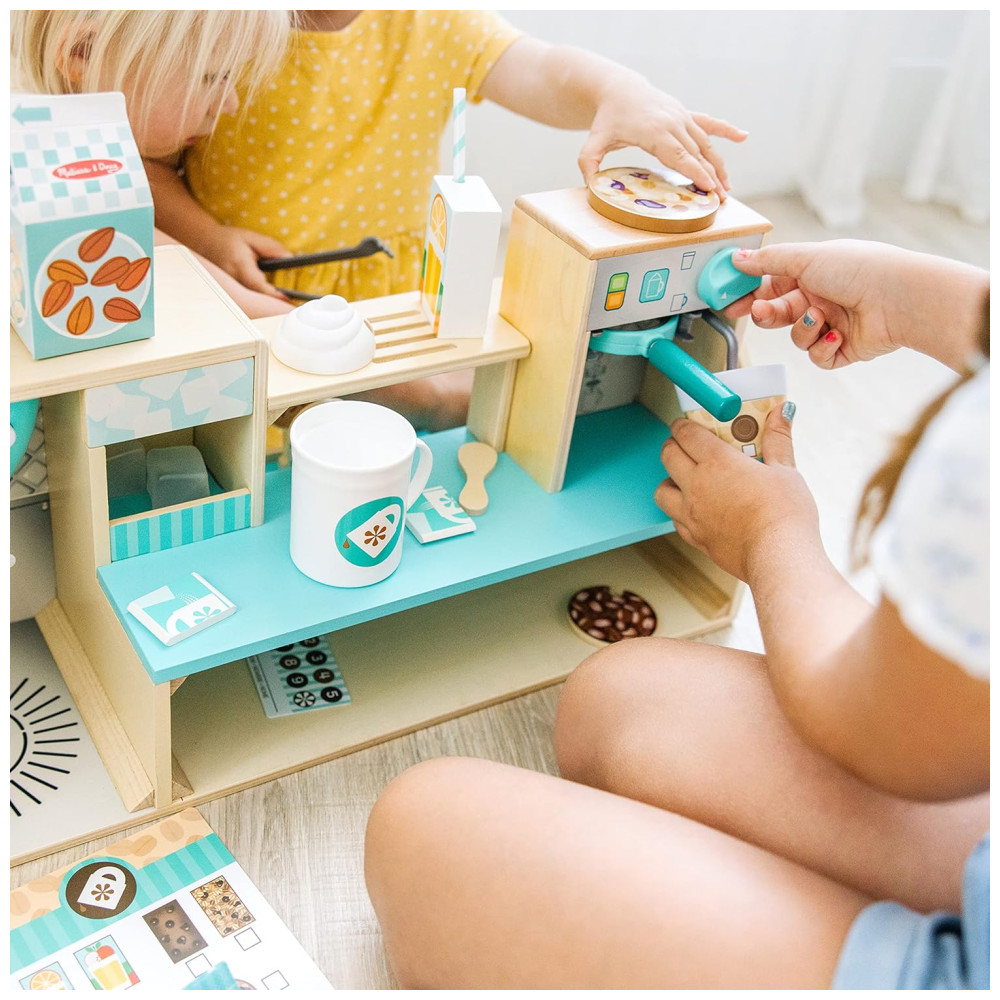 A Melissa Doug criou uma cafeteria de madeira completa para crianças de 3 a 7 anos, que podem se divertir sendo o barista ou o cliente. A cafeteira tem um filtro articulado e vaporizador, além de um dispensador de bebidas com bocal, permitindo que as crianças preparem expressos falsos, lattes com cobertura de chantilly, chá e bebidas geladas.