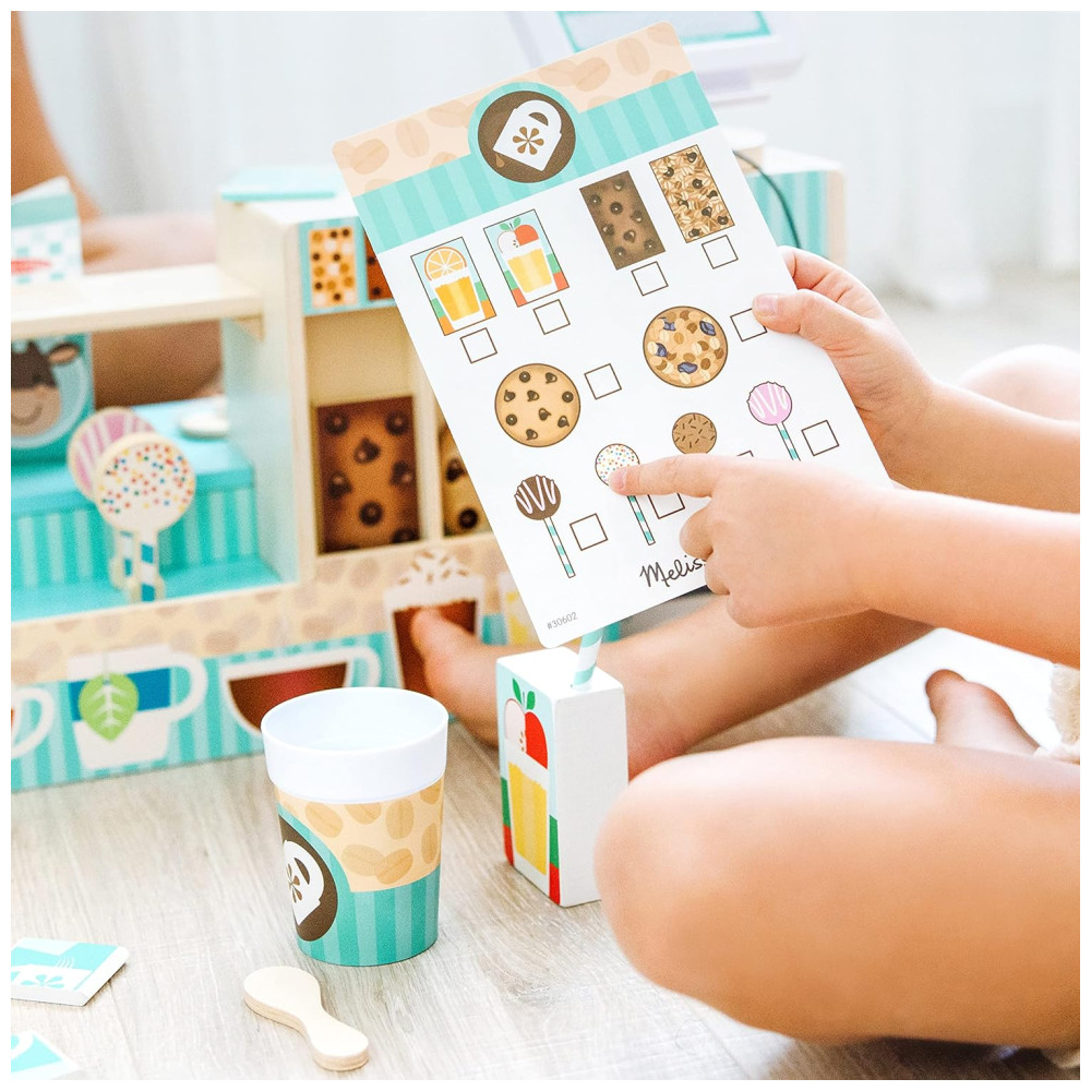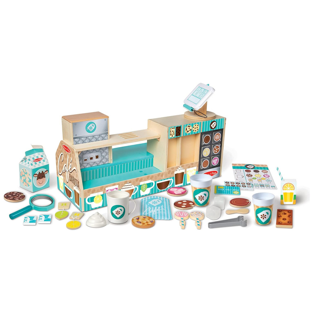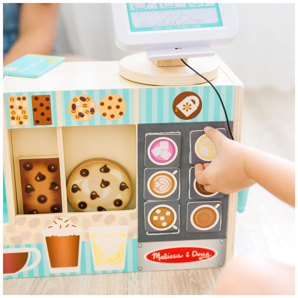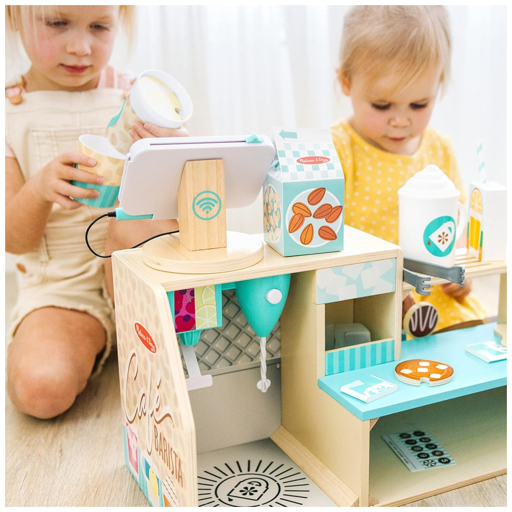 A Melissa Doug criou uma cafeteria de madeira completa para crianças de 3 a 7 anos, que podem se divertir sendo o barista ou o cliente. A cafeteira tem um filtro articulado e vaporizador, além de um dispensador de bebidas com bocal, permitindo que as crianças preparem expressos falsos, lattes com cobertura de chantilly, chá e bebidas geladas.