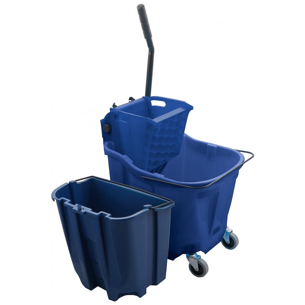 Grandes quantidades de água e solução de limpeza podem ser movidas facilmente em rodas duráveis com tecnologia anti salpicos e anti dica.A capacidade de 35 litros permite limpar mais com menos viagens. A alça ergonômica do espremedor de uma peça foi redesenhada para impedir que suas mãos se cansem e é classificada para durar 200.000 ciclos. Todas as peças são feitas com plástico de polietileno resistente a corrosão e resistente à corrosão, tornando as mais seguras e fáceis de manter limpas. Esses baldes de esfregona vêm em uma seleção de cores e são feitos para atender às diretrizes HACCP