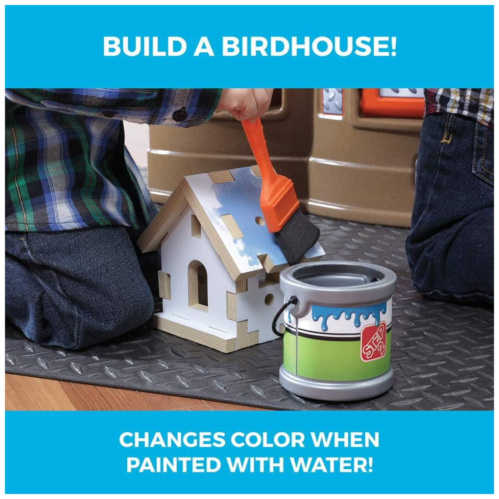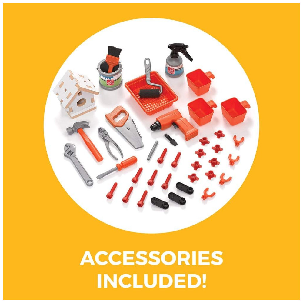 Inclui 45 acessórios, como ferramentas, furadeira eletrônica, bancada de trabalho, casinha para pássaros e muito mais. Os sons realistas tornam a brincadeira ainda mais divertida e imersiva (pilhas não incluídas).