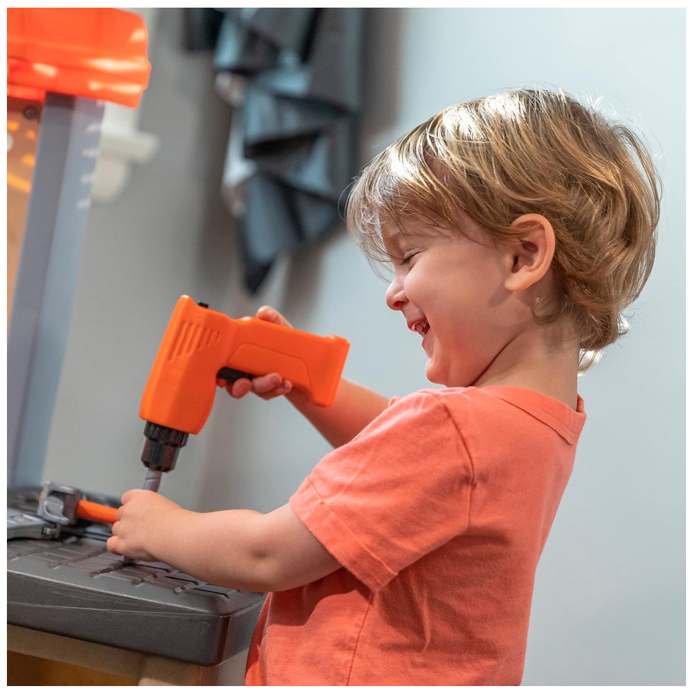 BRINQUEDOS INTERATIVOS: Sons realistas e um conjunto de ferramentas com 35 peças que incluem banco de trabalho, furadeira e ferramentas. (Pilhas não inclusas)