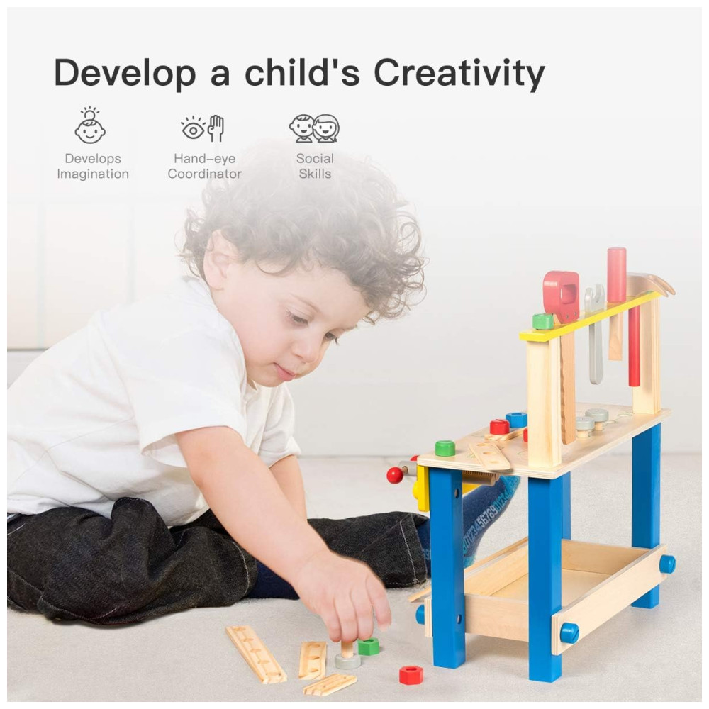 A Bancada Robud é feita de madeira maciça, garantindo uma construção robusta e durável. Sua superfície é lisa, sem rebarbas, e todos os cantos são arredondados para garantir a segurança das crianças. Fácil de montar, a bancada de madeira vem com seu próprio ‘kit de montagem’ em madeira, sem a necessidade de parafusos metálicos, porcas ou outras ferramentas reais. Seu filho pode tentar desmontá-la e remontá-la. Com cores vibrantes, esta bancada de madeira é altamente atrativa para crianças. Possui várias ferramentas de madeira simuladas para estimular a criatividade, como chave de fenda, serrote, martelo e parafuso. Ao brincar com esse brinquedo, as crianças usarão a imaginação, simulando diversas atividades. Outras crianças podem participar do jogo em grupo, sem brigas pelo brinquedo. Um presente incrível para ensinar crianças a usar ferramentas, adequado para qualquer ocasião como presente para meninos e meninas, garantindo diversão sem fim.