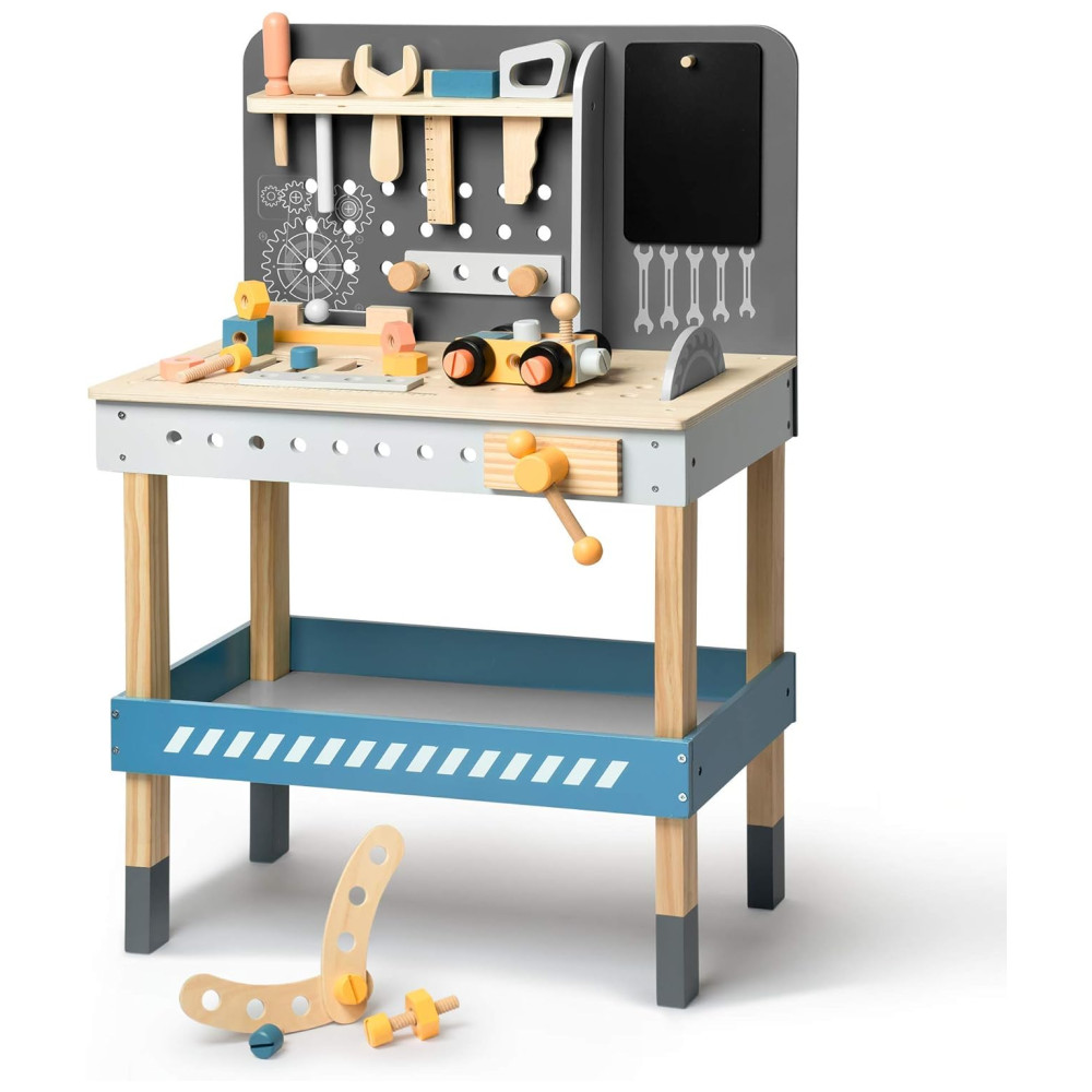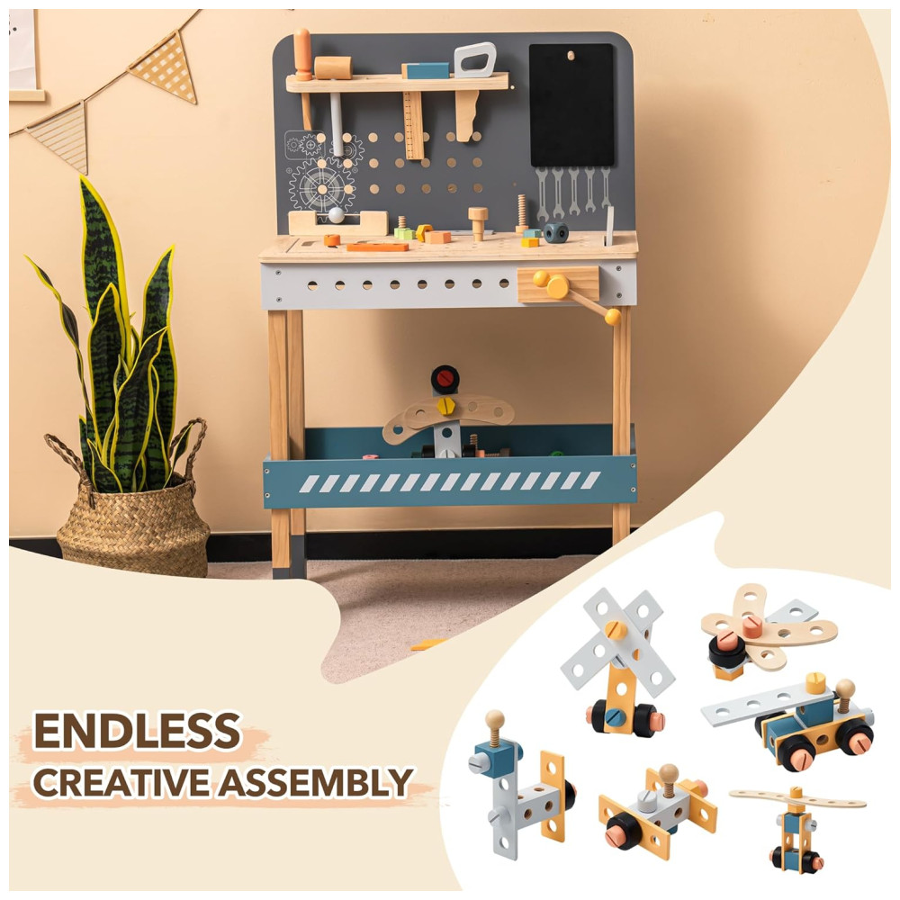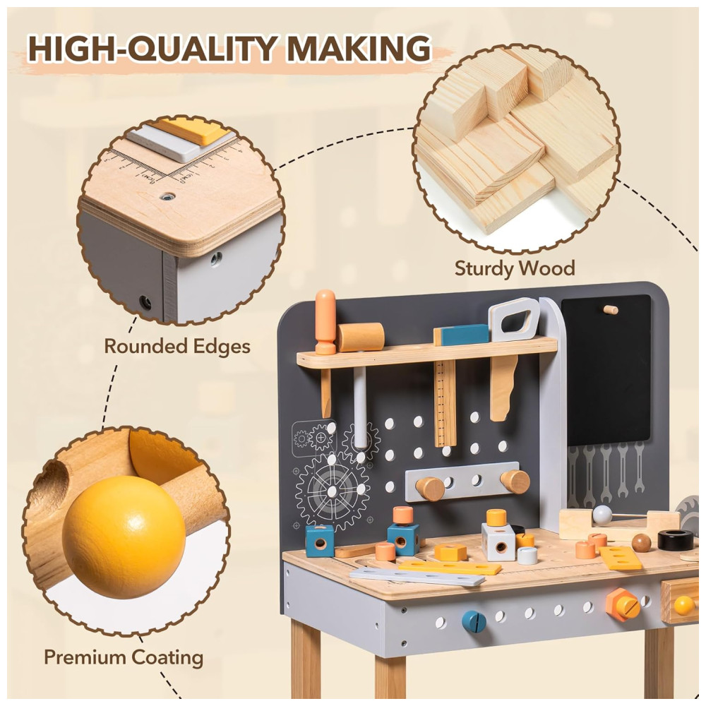 JOGO DE FAZ DE CONTA – Conjunto de construção de brinquedo realista para crianças, inclui um torno funcional, serra de mesa, quadro negro, conjunto de ferramentas de madeira, várias peças e ideias de projetos para estimular a imaginação. DIVERTIDA BANCADA DE FAZ DE CONTA – Ao brincar com este brinquedo, as crianças usarão constantemente a imaginação, se divertindo ao simular várias atividades. Outras crianças podem participar do jogo multiplayer, sem brigas pelo brinquedo. ORGANIZAÇÃO PRÁTICA – A bancada de madeira inclui prateleira de armazenamento conveniente e gancho para coletar todas as peças, incentivando as crianças a desenvolverem bons hábitos de organização de brinquedos. SEGURANÇA EM PRIMEIRO LUGAR – A Bancada Robud é feita de madeira maciça, com construção resistente e durável, superfície lisa sem rebarbas, design com cantos arredondados, prevenindo acidentes. ÓTIMO PRESENTE – Um bom brinquedo educativo para ensinar crianças a usar ferramentas, adequado para qualquer ocasião como presente para meninos e meninas, proporcionando diversão sem fim.