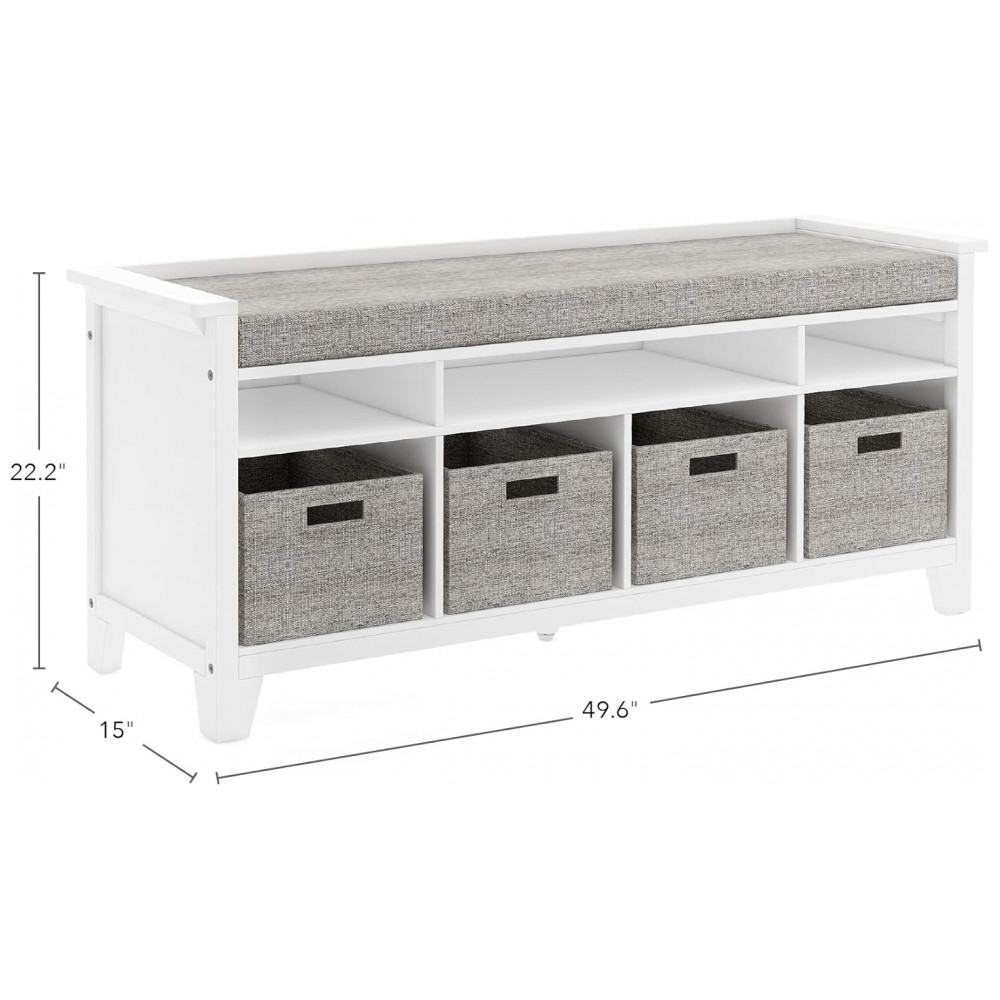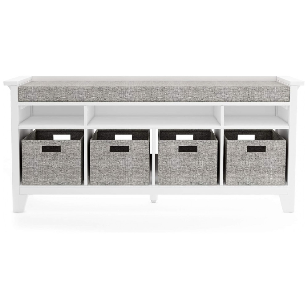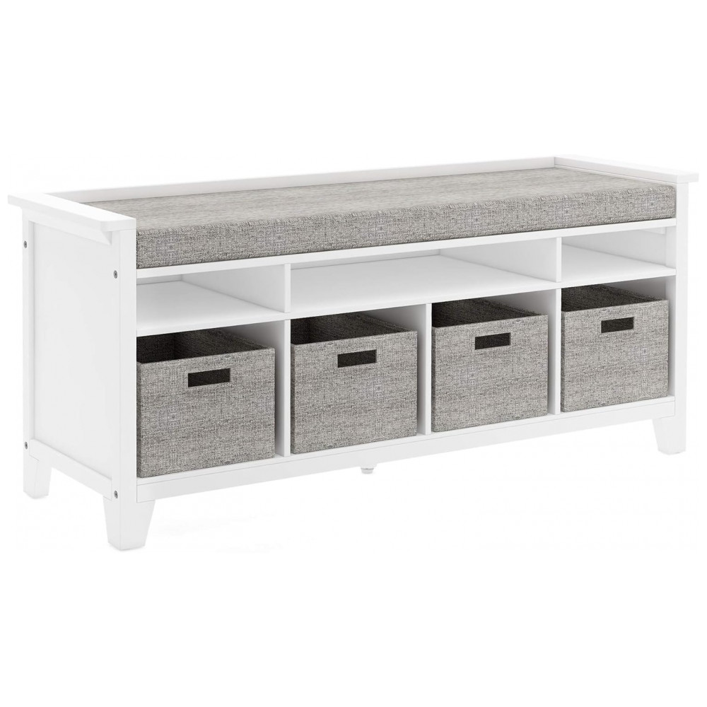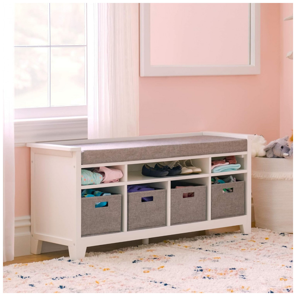Banco organizador infantil Martha Stewart Living & Learning Linen White em madeira com assento almofadado nichos e 4 cestos de tecido