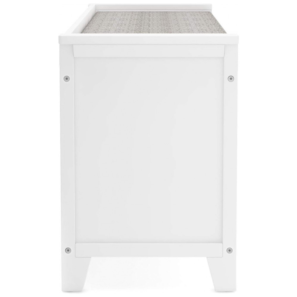 O Martha Stewart Kids’ Storage Bench Linen White é um banco infantil baixo com assento almofadado e estrutura em madeira, projetado para organizar brinquedos, livros, sapatos e acessórios em quartos infantis, halls de entrada e brinquedotecas. A peça combina laterais e base em madeira de bétula com componentes em madeira engenheirada, acabamento em branco fácil de limpar e cantos arredondados para uso diário por crianças.