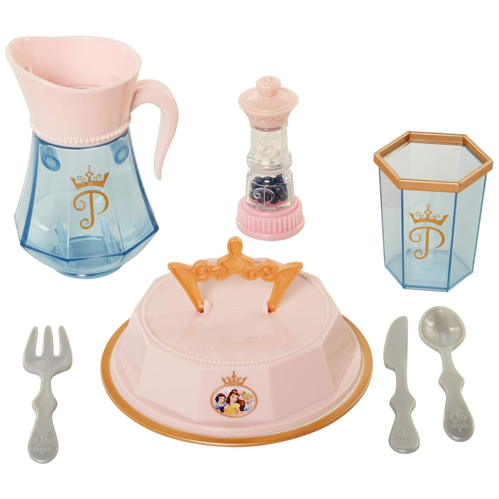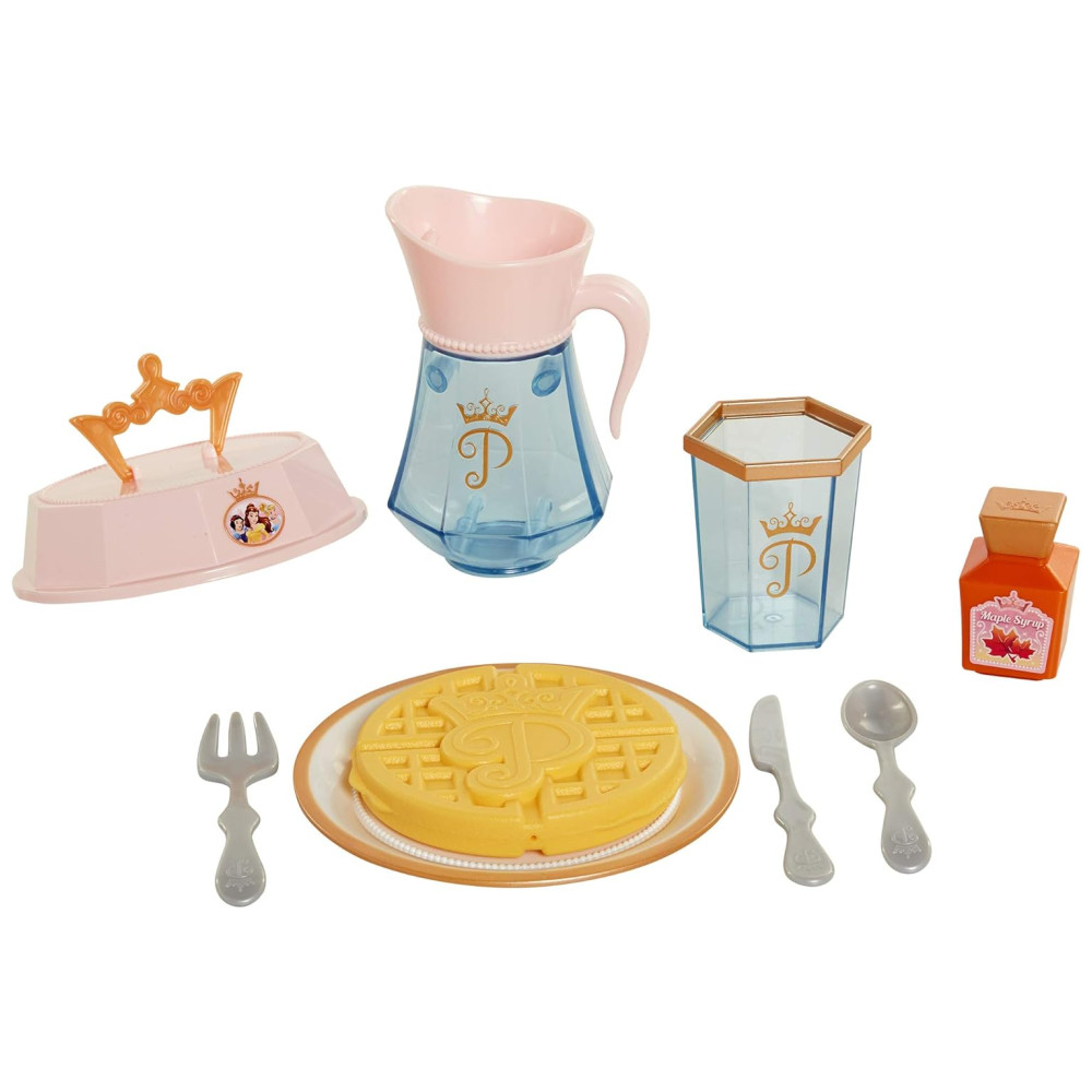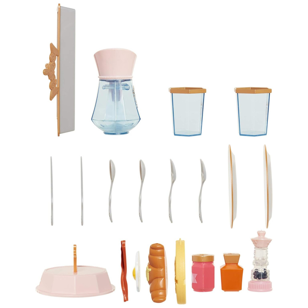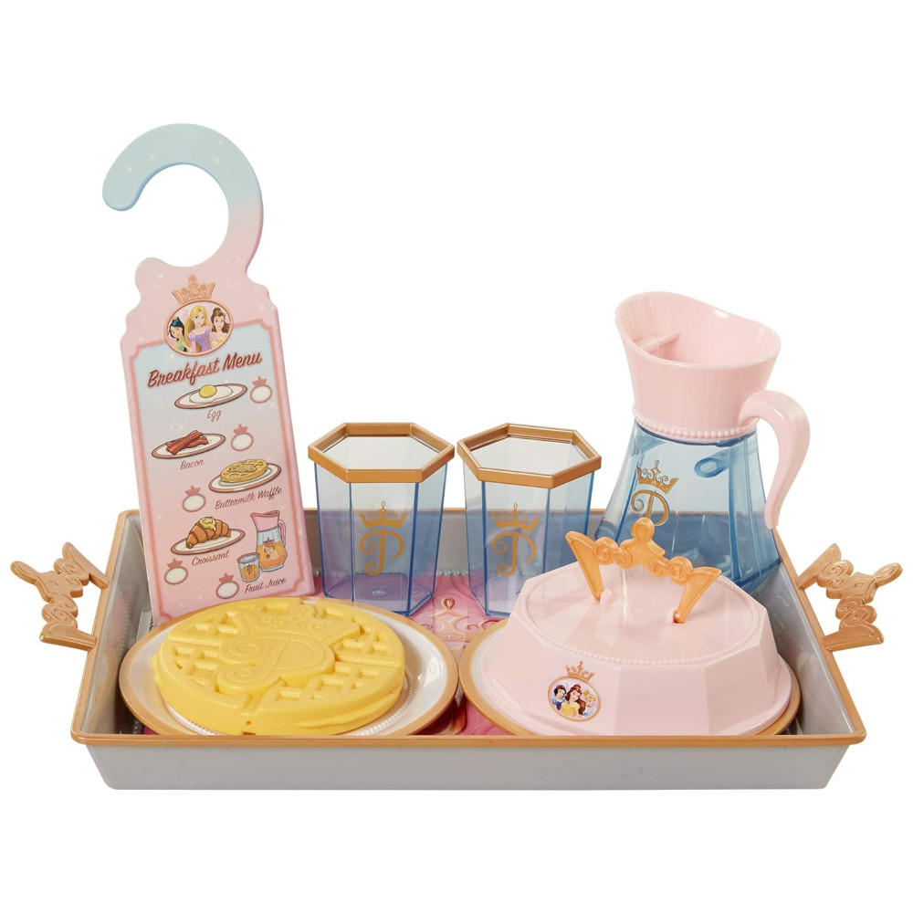 Inclui 1 bandeja, 1 tampa de prato, 2 pratos, 1 jarra, 2 copos, 2 garfos, 2 colheres, 2 facas, 1 saleiro, 1 pote de xarope, 1 pote de geléia, 1 waffle, 1 croissant, 1 pedaço de bacon, 1 ovo e 1 cabide de porta. Este conjunto é sugerido para crianças maiores de 3 anos, proporcionando diversão e criatividade em cada refeição de conto de fadas.