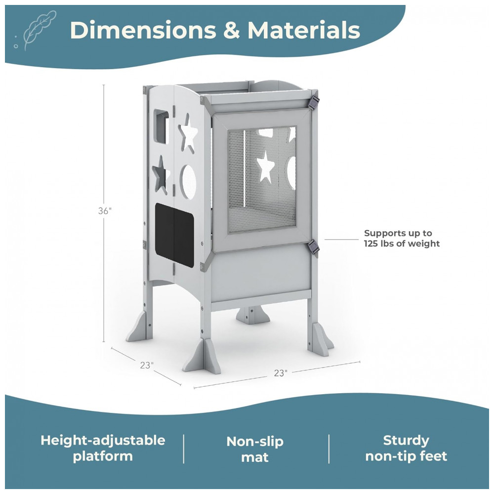 Conteúdo da embalagem: 1 torre de aprendizagem Guidecraft Classic Kitchen Helper cinza, tapete antiderrapante, Kitchen Helper Keepers, kit de montagem, manual do usuário