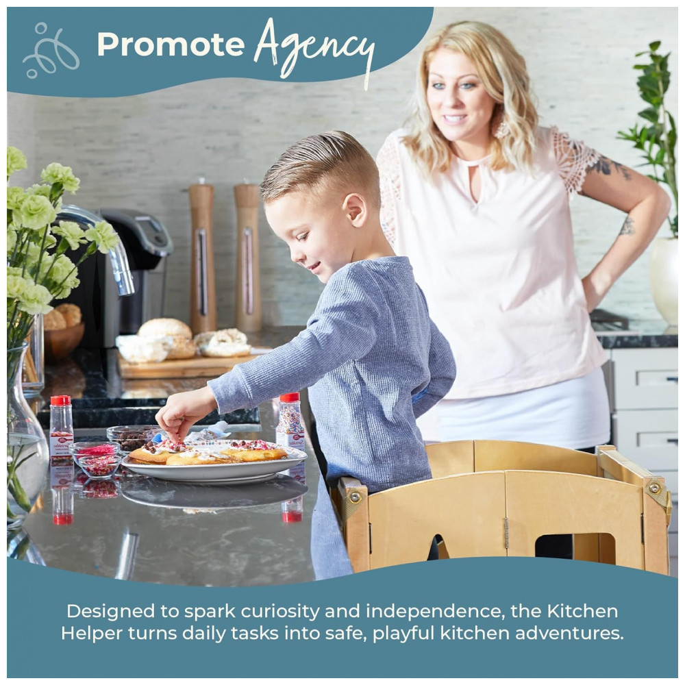 A banqueta torre de aprendizagem Guidecraft Classic Kitchen Helper Cinza é um banco auxiliar de bancada em madeira, dobrável e com altura ajustável, indicada para crianças a partir de 18 meses. A estrutura foi projetada para elevar a criança até a altura da bancada de cozinha com maior estabilidade, permitindo participação em atividades domésticas com supervisão adulta.