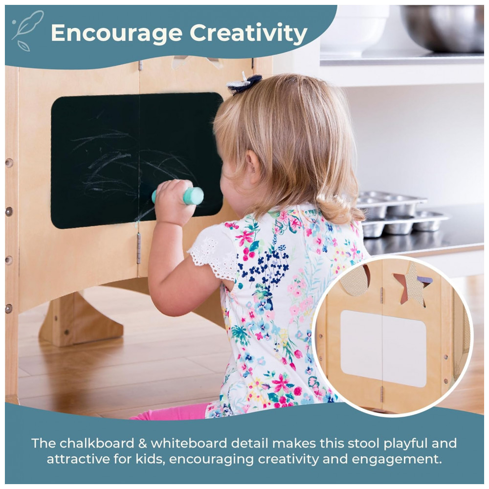 Recursos especiais: Altura ajustável, estrutura leve, tapete antiderrapante, Kitchen Helper Keeper, quadro de giz lateral