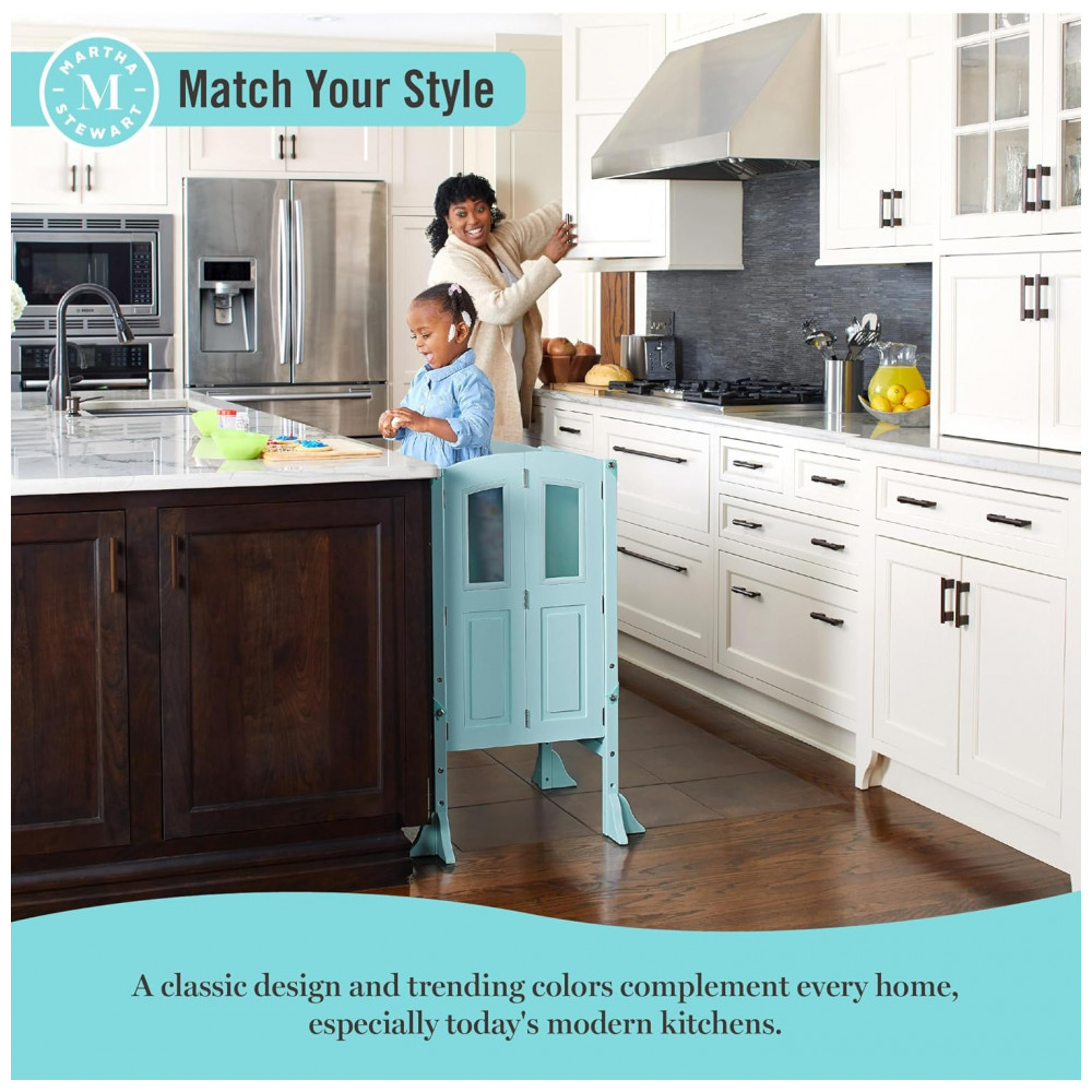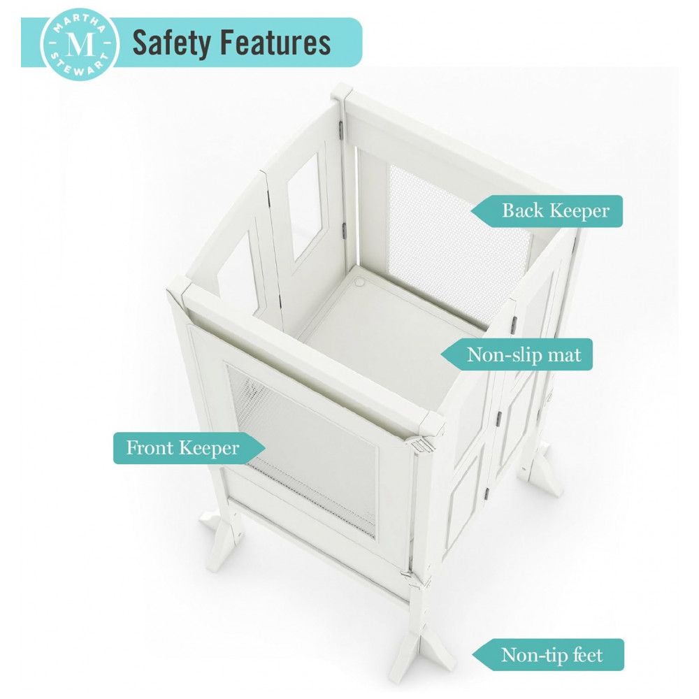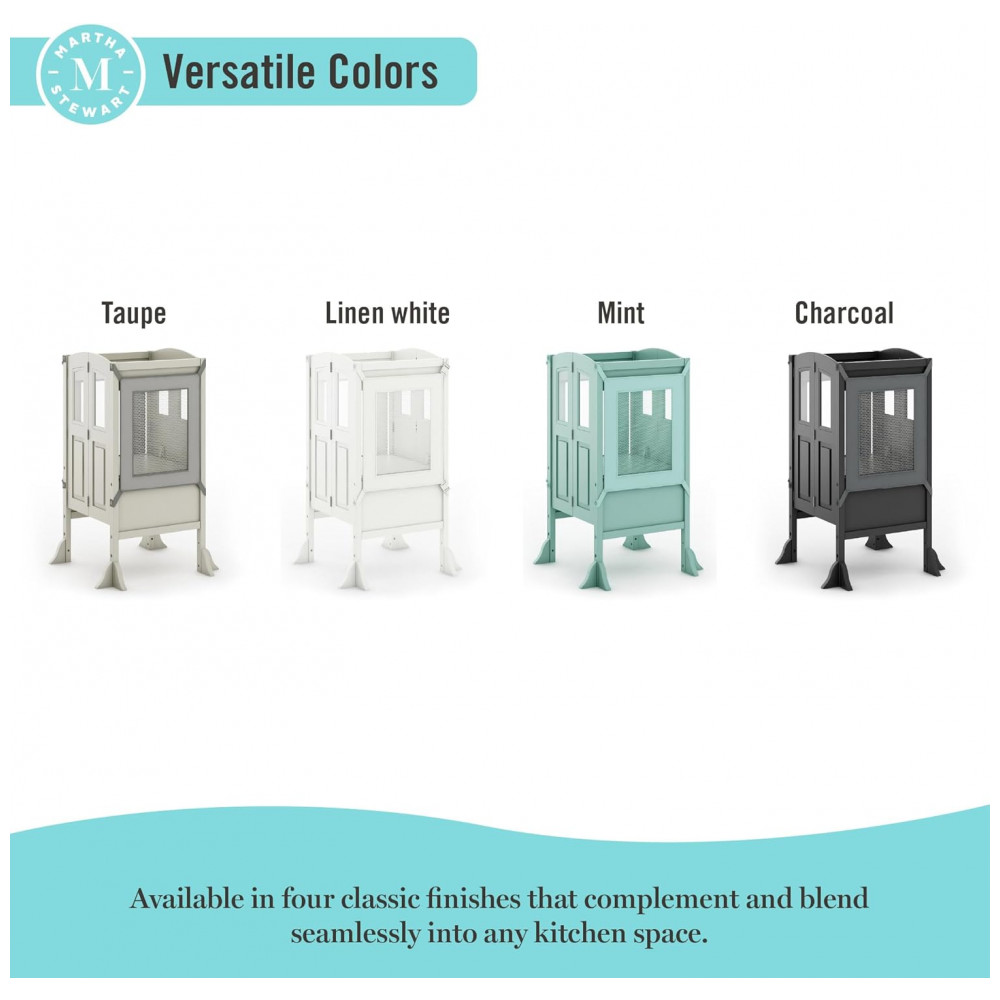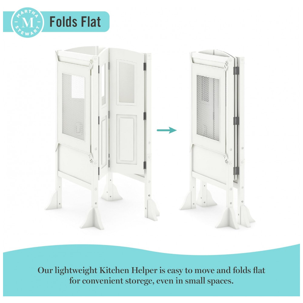 A banqueta torre de aprendizagem Martha Stewart Kitchen Helper Linen White é uma estrutura infantil em madeira, dobrável e com altura ajustável, desenvolvida para que crianças a partir de 18 meses alcancem a altura da bancada com mais segurança. O design em branco linho com laterais recortadas e janelas integra-se a cozinhas residenciais, permitindo que a criança participe de atividades de preparo de alimentos e outras tarefas sob supervisão de um adulto.