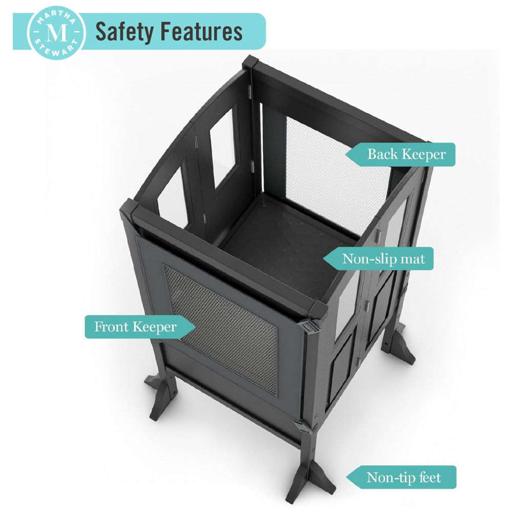 O design dobrável permite que a torre seja fechada e armazenada em espaços reduzidos quando não estiver em uso, mantendo o conjunto leve o suficiente para ser movimentado por um adulto. A base de apoio inclui tapete antiderrapante e barreira frontal tipo “Kitchen Helper Keeper”, que ajudam a reduzir o risco de escorregamento durante o uso, desde que haja supervisão adulta contínua.