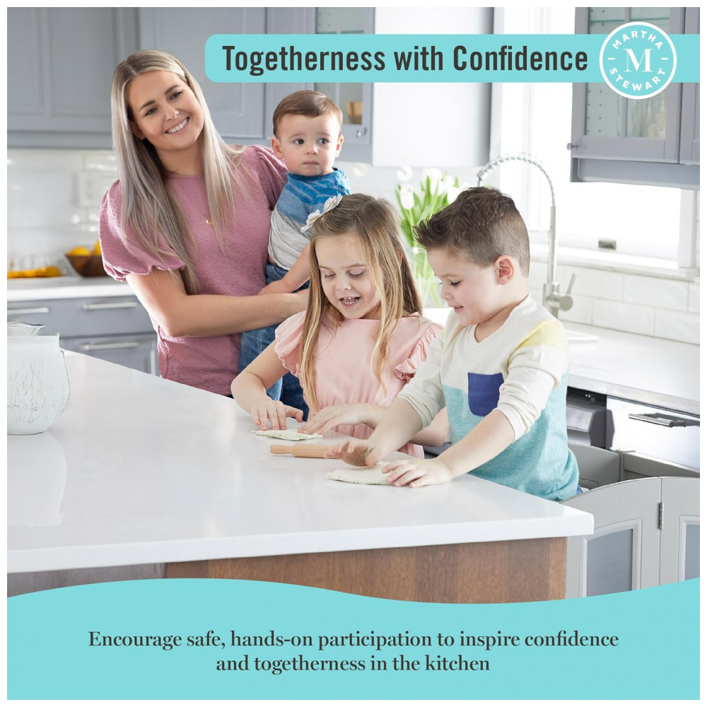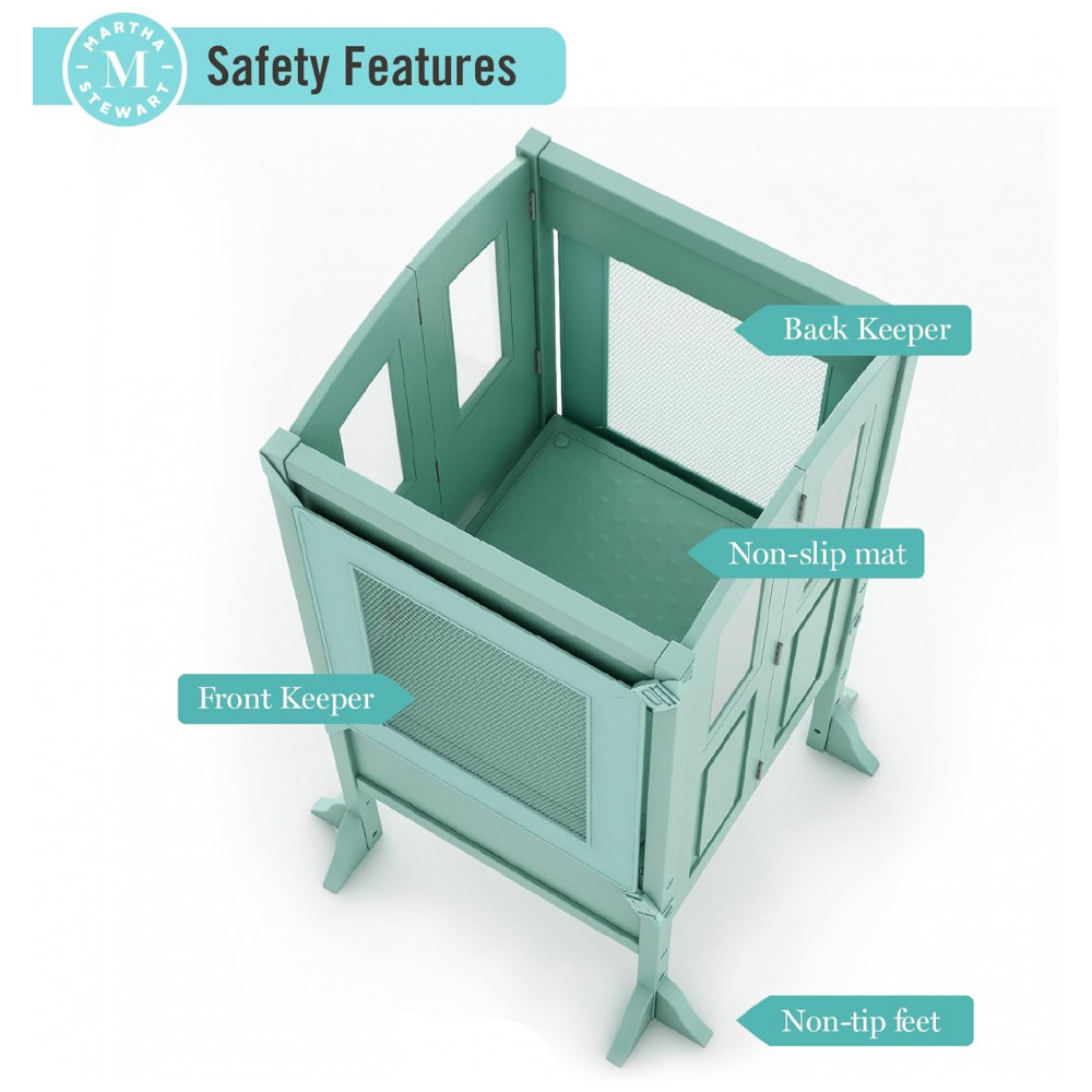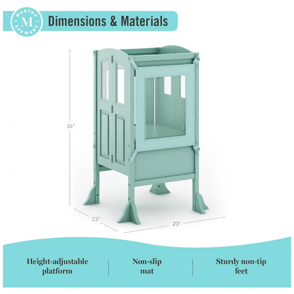 A banqueta torre de aprendizagem Martha Stewart Kitchen Helper Mint é uma estrutura infantil em madeira, dobrável e com altura ajustável, projetada para crianças a partir de 18 meses alcançarem a altura da bancada com mais segurança. Com design de inspiração clássica e acabamento em tom menta, a peça foi pensada para uso em cozinhas residenciais, permitindo que a criança participe de atividades cotidianas sob supervisão adulta.