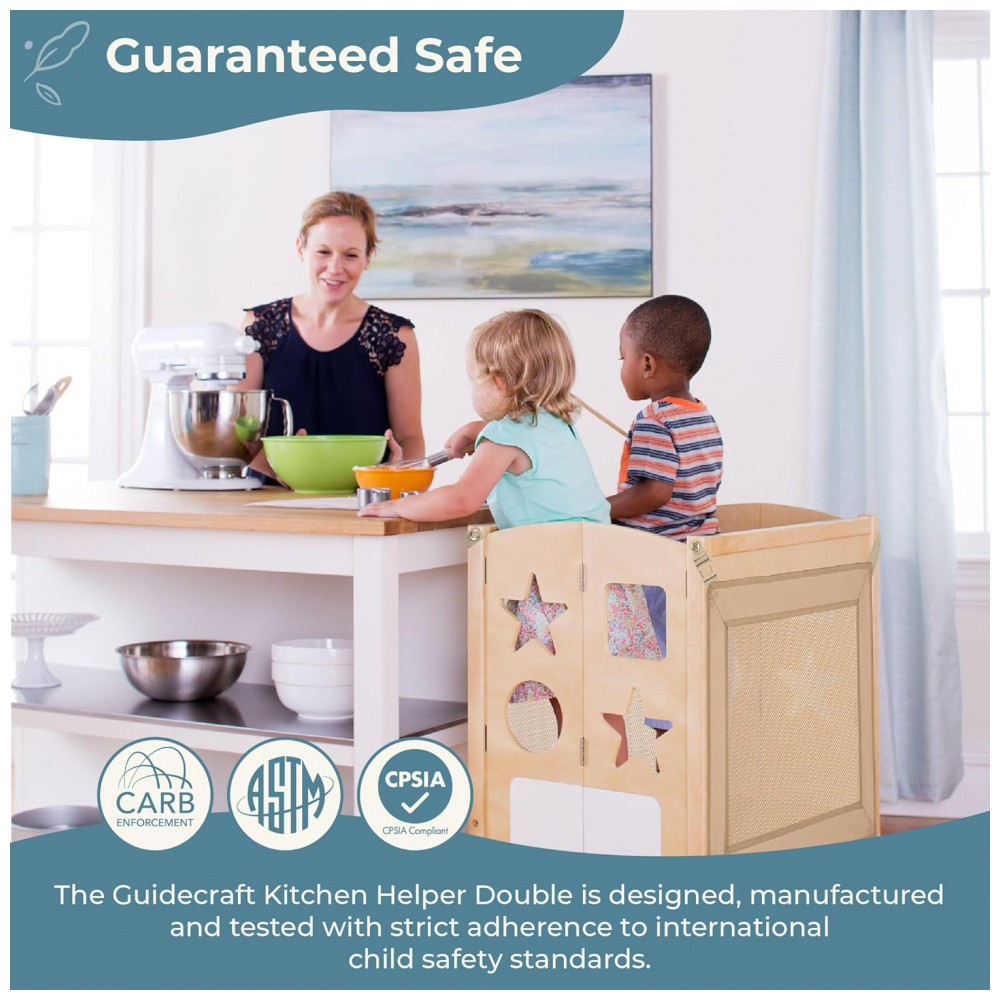 A banqueta torre de aprendizagem dupla Guidecraft Contemporary Double Kitchen Helper é um banco auxiliar de bancada extra largo, projetado para acomodar duas crianças simultaneamente a partir de 18 meses. A estrutura é dobrável e de altura ajustável, permitindo uso em cozinhas residenciais com espaço limitado, facilitando o armazenamento quando não está em uso.