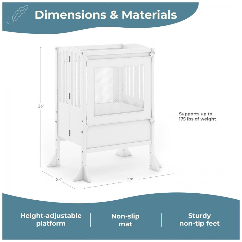 Conteúdo da embalagem: 1 torre de aprendizagem Guidecraft Contemporary Double Kitchen Helper branca, tapete antiderrapante, Kitchen Helper Keeper, kit de montagem, manual do usuário