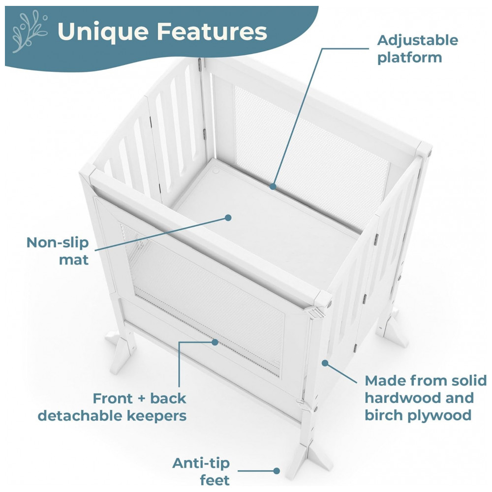 A plataforma interna pode ser ajustada em duas posições aproximadas de altura, equivalentes a 38 cm e 46 cm em relação à base, acompanhando o crescimento das crianças e mantendo altura de trabalho adequada em relação à bancada. A construção utiliza combinação de madeira maciça, compensado e madeira engenheirada com acabamento atóxico resistente a riscos, com capacidade de suporte de até cerca de 79,4 kg distribuídos entre duas crianças.