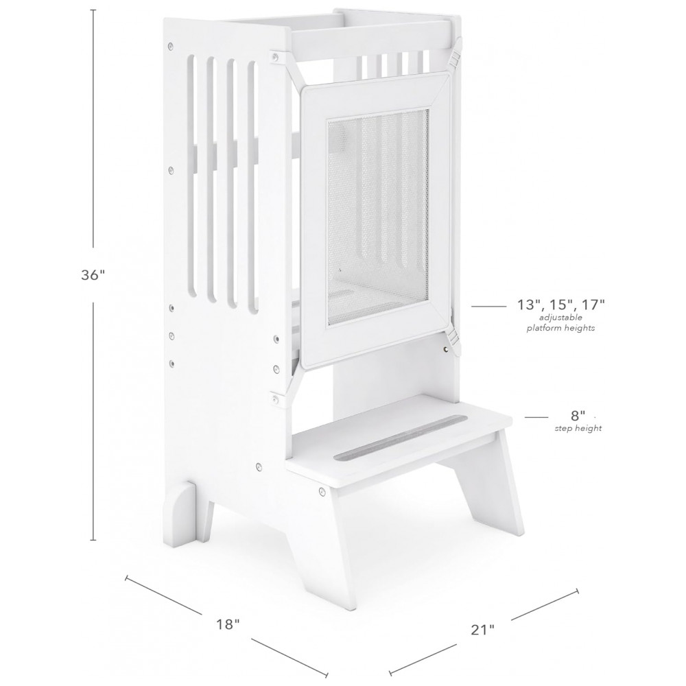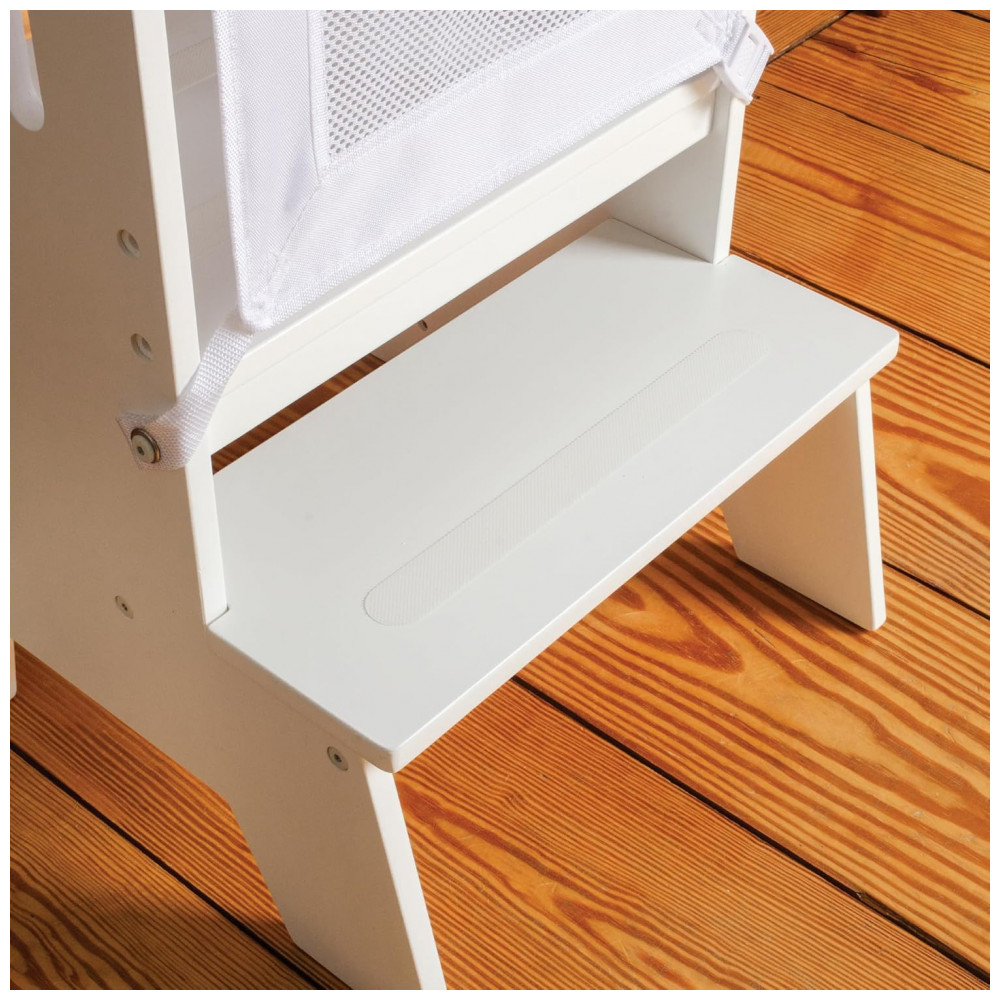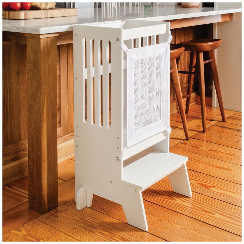 Conteúdo da embalagem: 1 torre Guidecraft Jr. Contemporary Kitchen Helper Step-Up branca, Keeper em rede, kit de montagem, manual do usuário