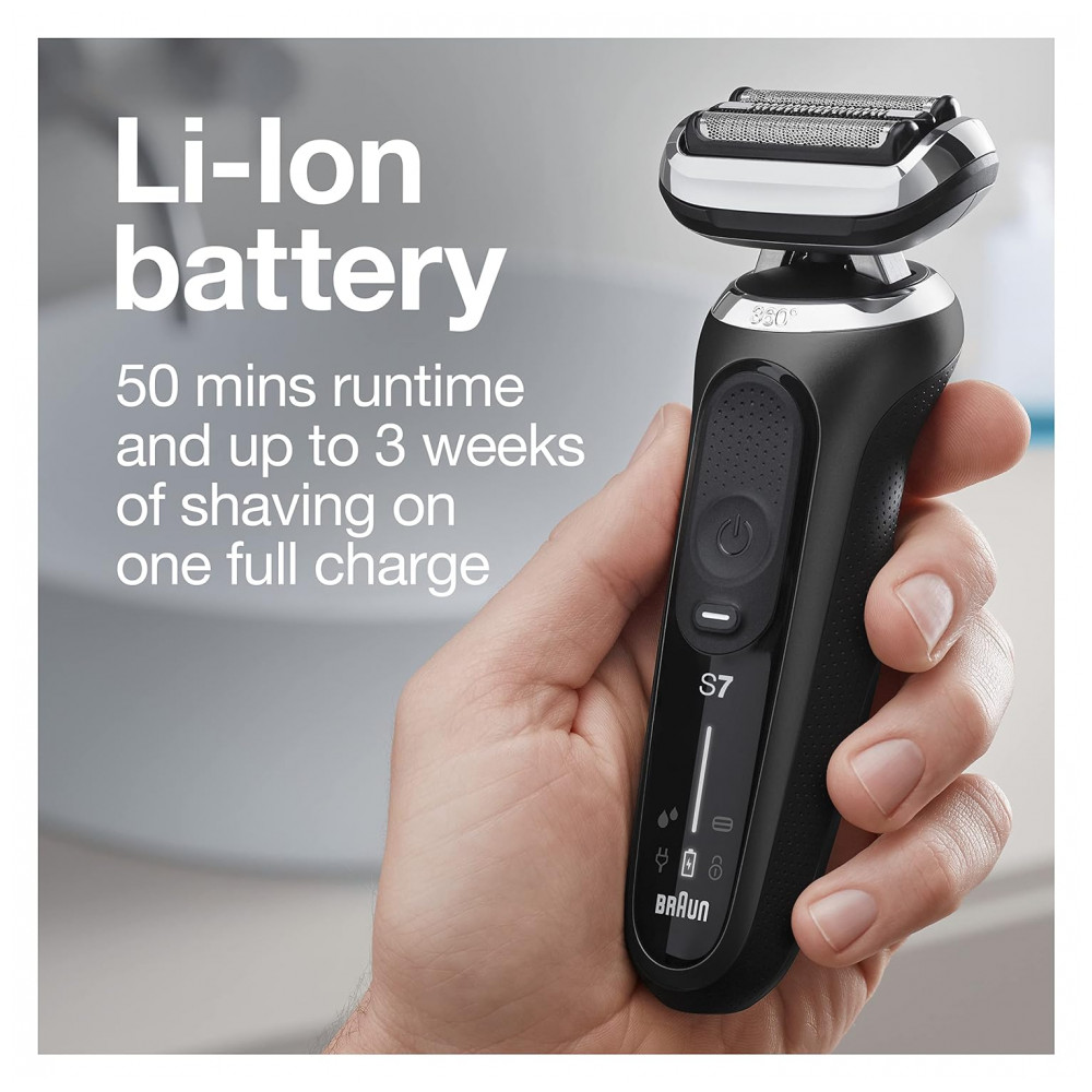 Bateria Li Ion para até 3 semanas de barbear 50 min. Carga rápida de 5 minutos para um barbear completo.