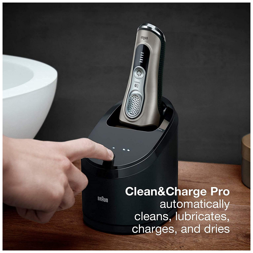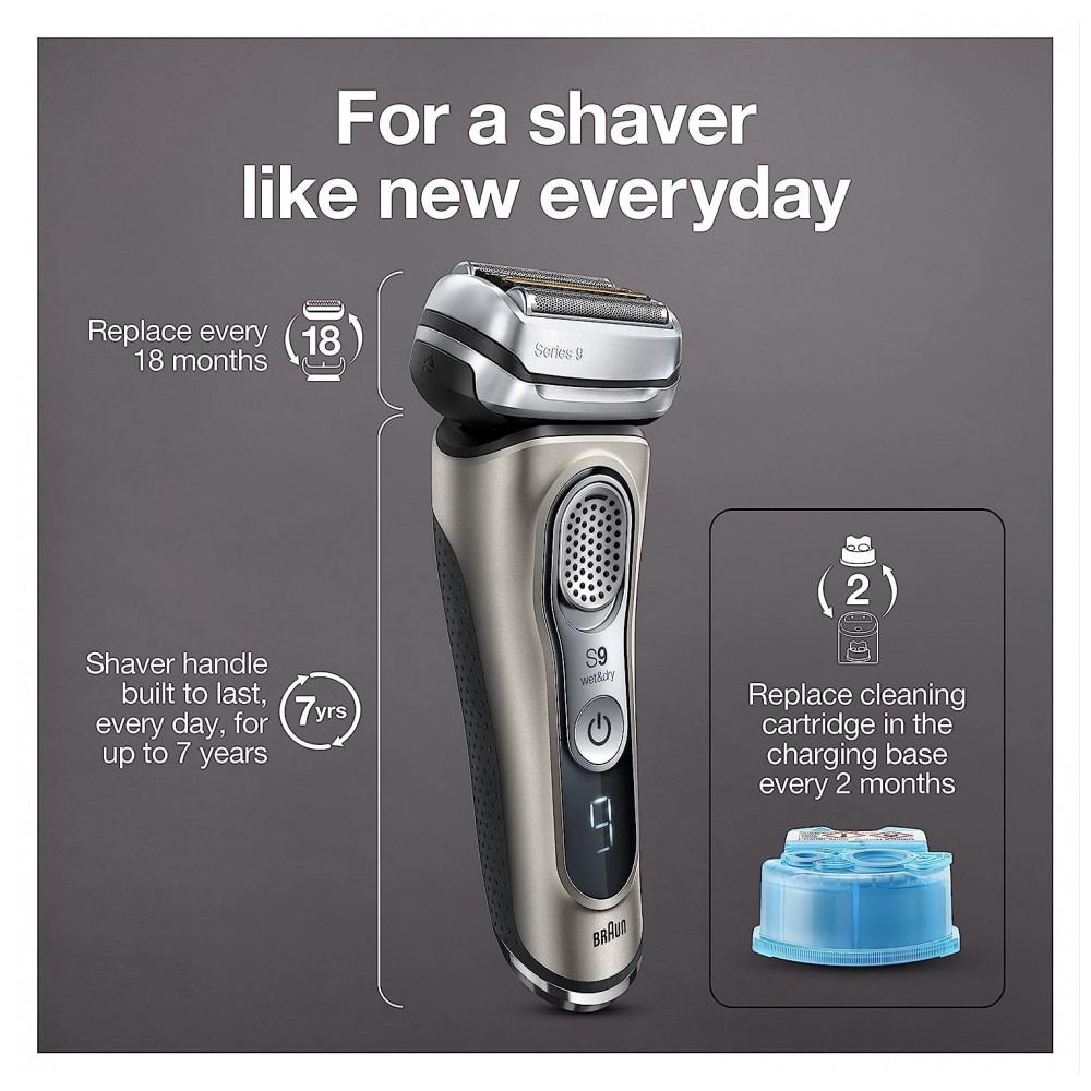 O QUE ESTÁ NA CAIXA Barbeador elétrico Série 9, Clean Charge Station que seleciona de forma inteligente um programa de limpeza higiênico que lubrifica, seca e carrega seu barbeador cartucho de limpeza, estojo de viagem em couro, escova de limpeza, cabo de carregamento e manual do usuário