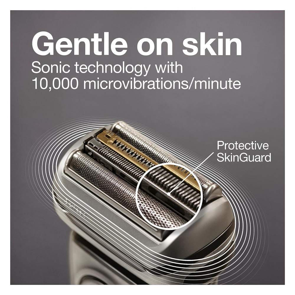 REMOÇÃO DE PÊLO SUAVE A tecnologia SyncroSonic fornece 10.000 vibrações sônicas por minuto para permitir que o barbeador deslize sobre a pele, combinado com o protetor SkinGuard integrado que suaviza a pele para um barbear mais confortável.