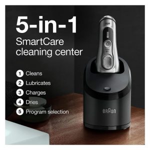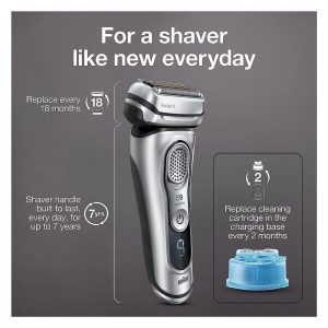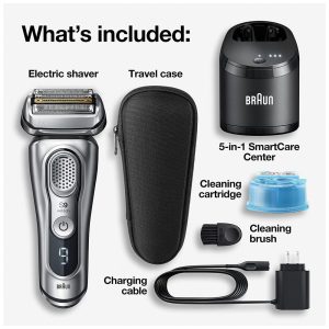 O QUE ESTÁ NA CAIXA Barbeador elétrico Série 9, Clean Charge Station que seleciona de forma inteligente um programa de limpeza higiênico que lubrifica, seca e carrega seu barbeador cartucho de limpeza, estojo de viagem em couro, escova de limpeza, cabo de carregamento e manual do usuário