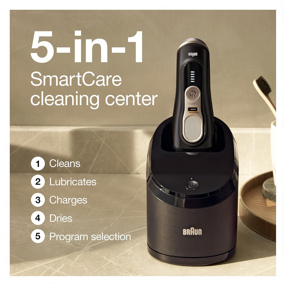 O QUE ESTÁ NA CAIXA Barbeador elétrico Series 9 Pro Centro SmartCare 5 em 1 que seleciona de forma inteligente um programa de limpeza higiênico que lubrifica, seca e carrega seu barbeador cartucho de limpeza, estojo de viagem em couro, escova de limpeza, cabo de carregamento e manual do usuário