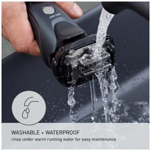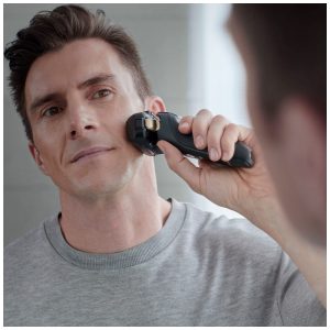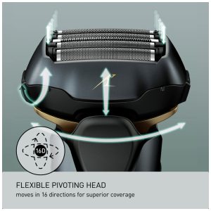 Cabeça de corte 16 D flexível gira sem esforço em 16 direções de forma independente para seguir e se adequar aos contornos naturais da pele e manter contato próximo com o rosto, pescoço, queixo e mandíbula.