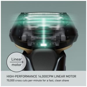 Motor de alto desempenho para um barbear rápido e poderoso o barbeador elétrico Panasonic ARC 5 usa um motor ultrarrápido e um sistema de 5 lâminas para fornecer até 70.000 cortes transversais por minuto, tornando o barbear mais rápido, suave e eficiente.