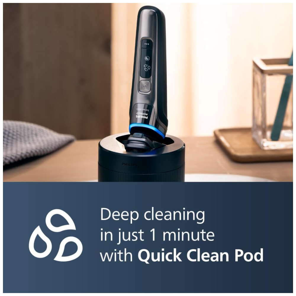 Capazes de fazer a barba a seco e a húmido, as máquinas de barbear podem ser utilizadas com acessórios de higiene e limpeza e limpas em menos de um minuto com a nova estação de limpeza Quick Clean Pod da Philips. Inclui barbeador elétrico, cápsula QuickClean, estojo de viagem e cabo de alimentação